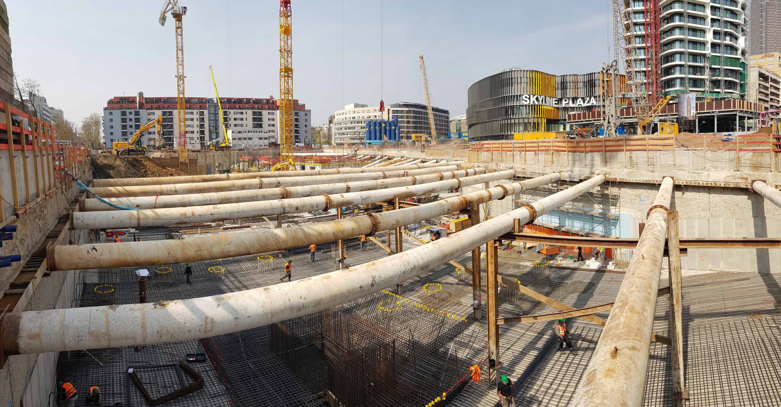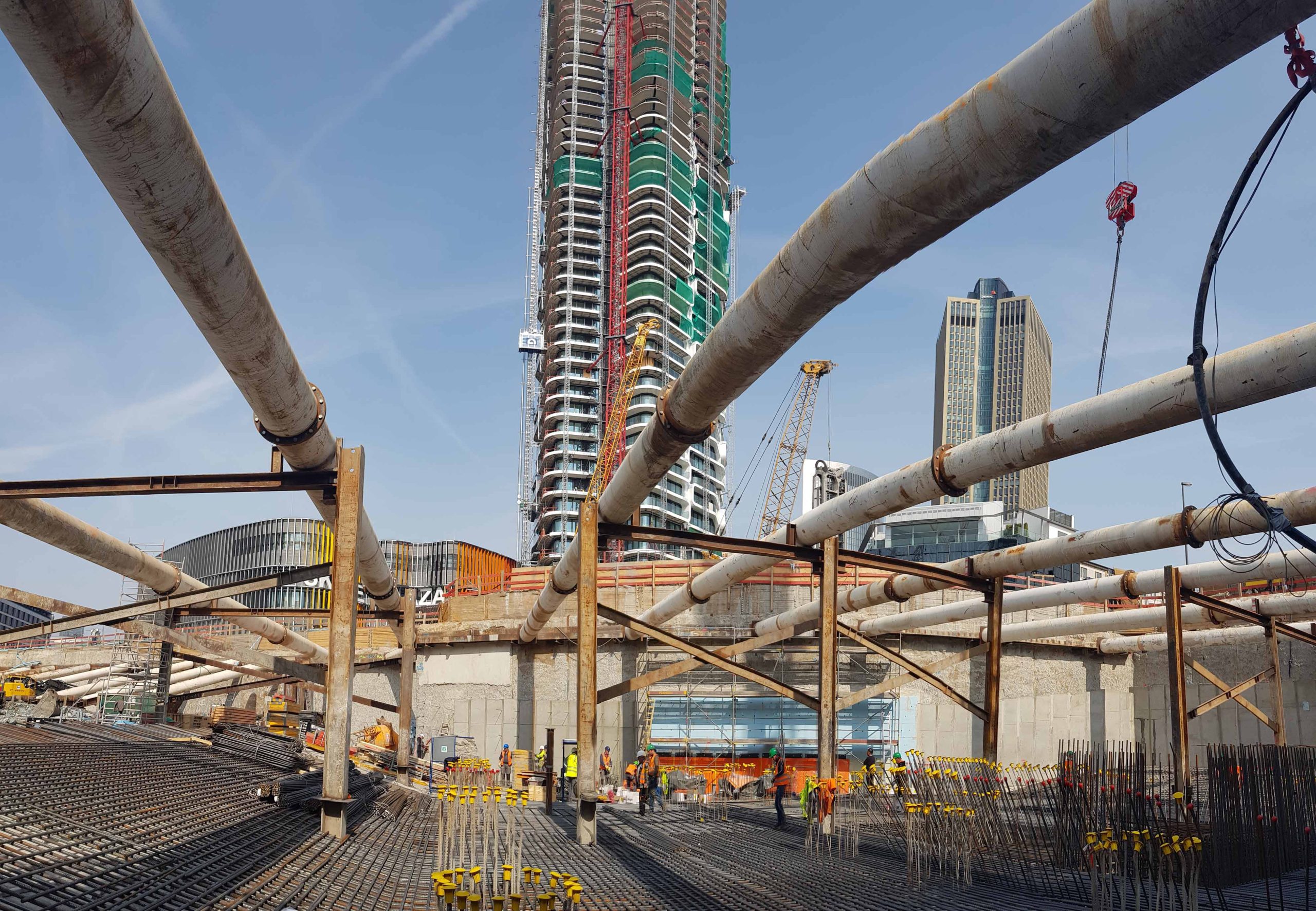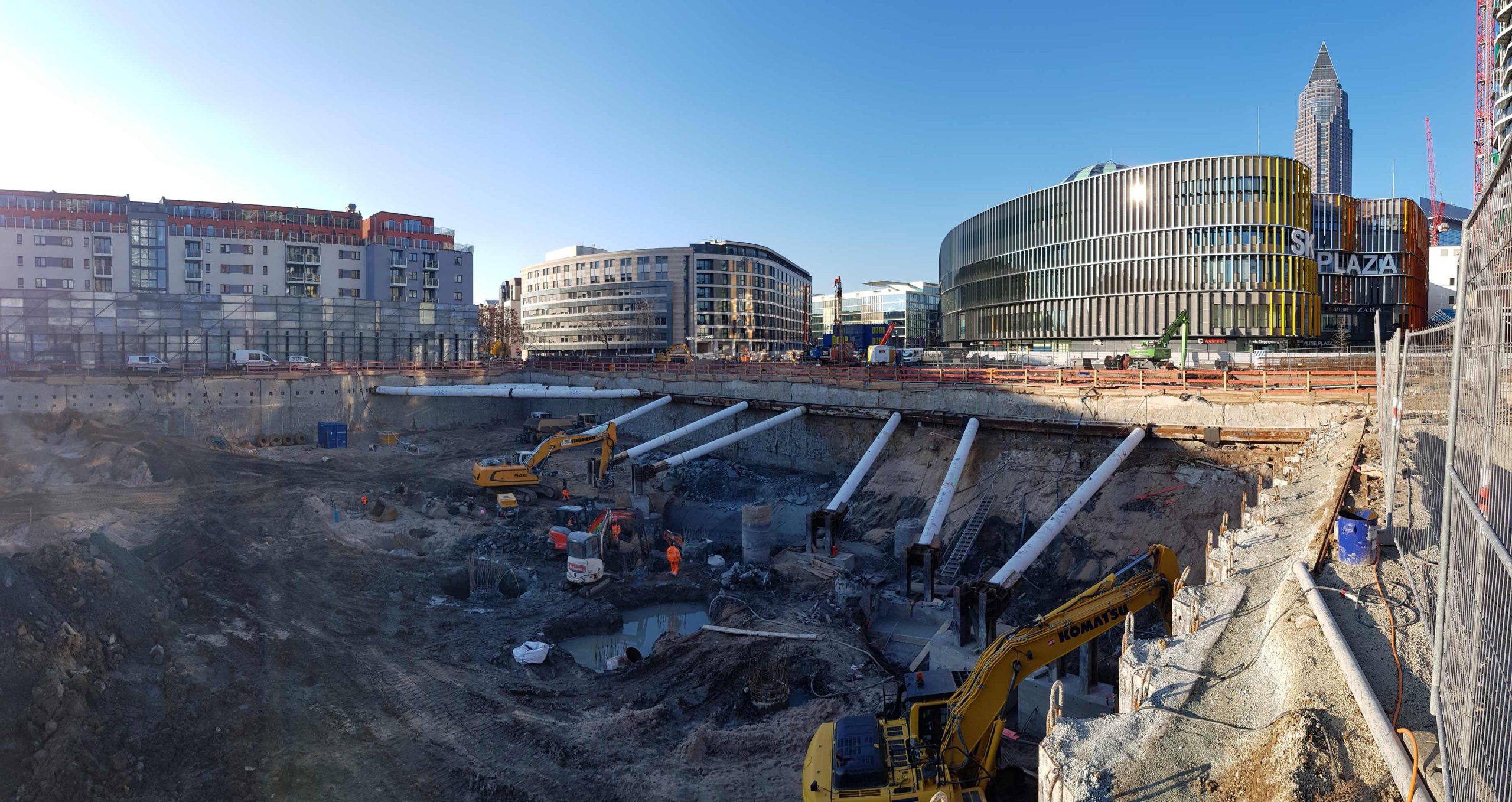 Neubau von drei Gebäuden in drei Teilbaugruben in Frankfurt am Main mit Schlitzwand und Baugrubensteifen.