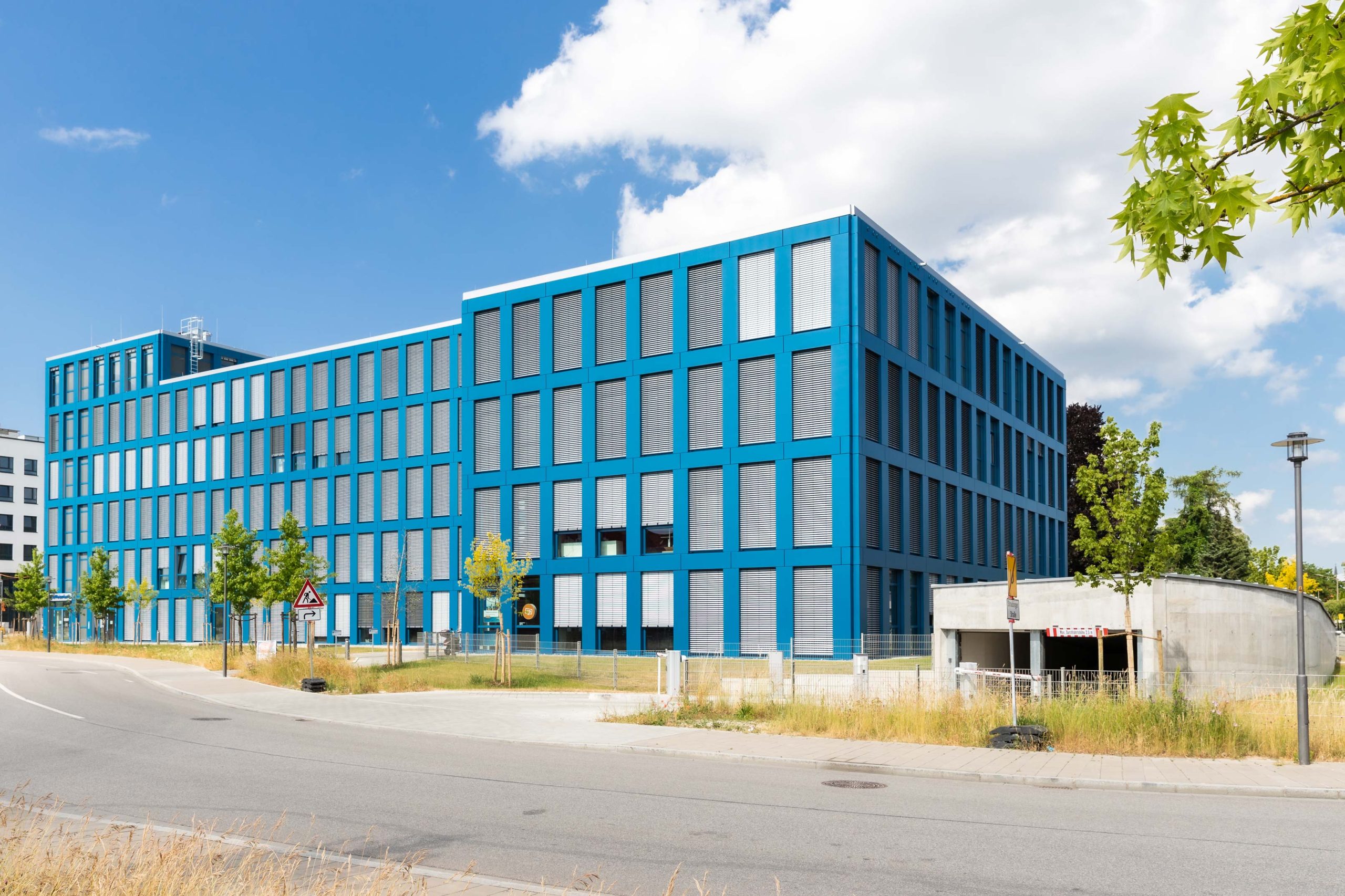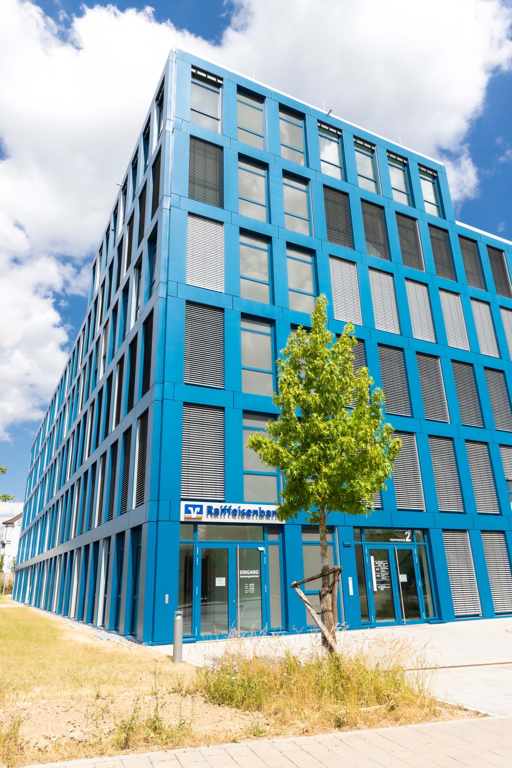 Neubau eines Bürogebäudes der Raiffeisenbank mit 5 Obergeschossen und einem Untergeschoss in Stahlbetonskelettbauweise mit Tiefgarage in Regensburg. Große Deckenöffnung im EG für Freitreppe mit Vorrichtung einer späteren Schließung zur flexiblen Mieterplanung.