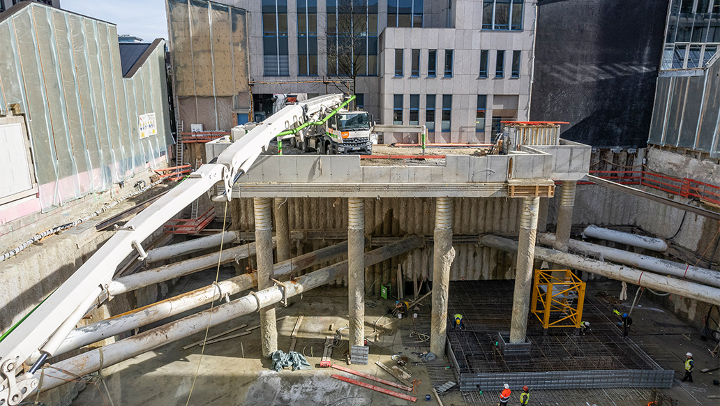Für die Erschließung des Baugeländes wurde eine Logistikplattform integriert. Unsere Ingenieurleistung der Seidl & Partner Gesamtplanung GmbH ist in diesem Projekt statisch wie auch logistisch sehr komplex, da sich umlaufend direkt angrenzende Nachbargebäude mit Bestandsverbauten befinden. Die Zufahrt zur Baugrube wird über eine Durchfahrt durch eines dieser Bestandsgebäude ermöglicht.