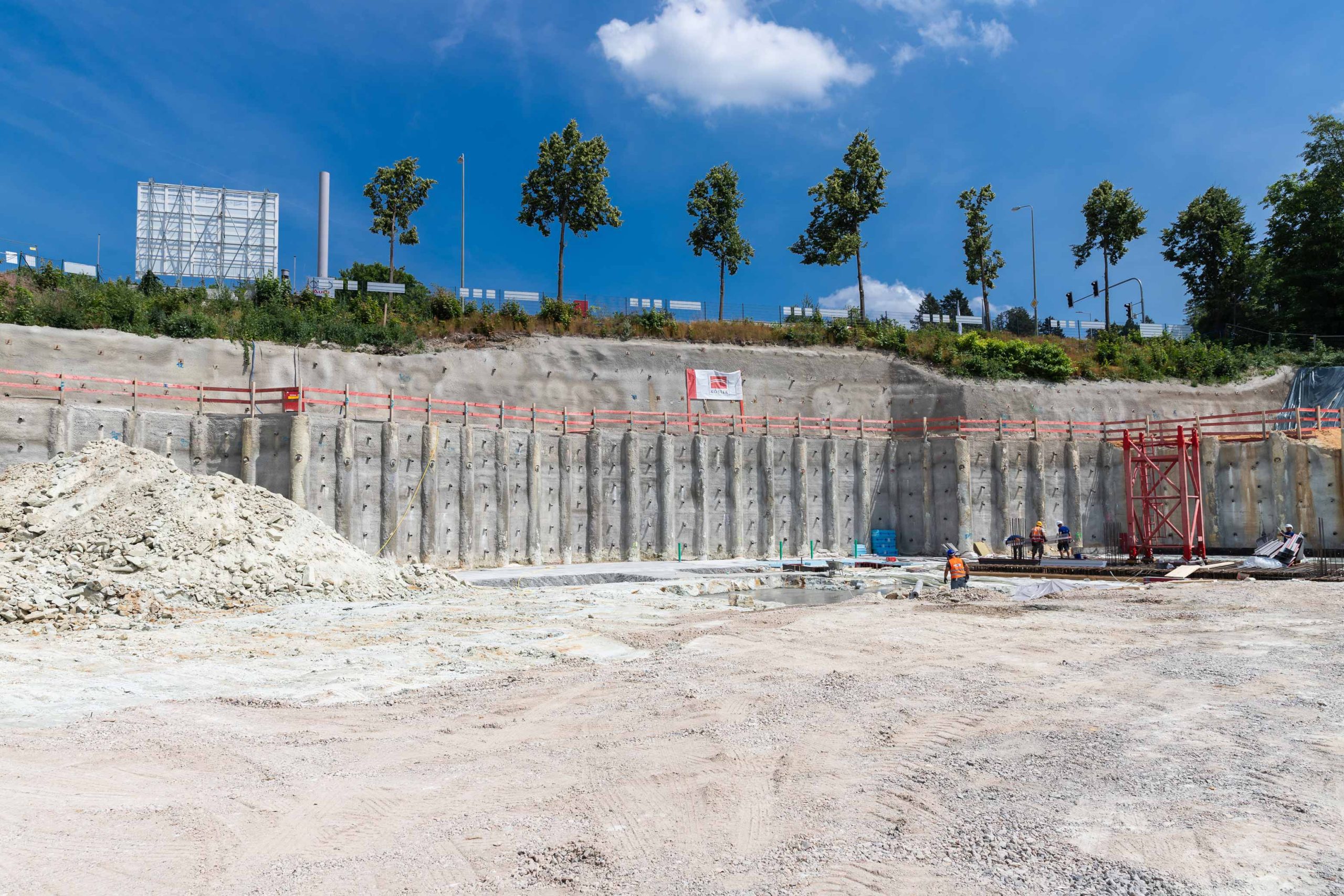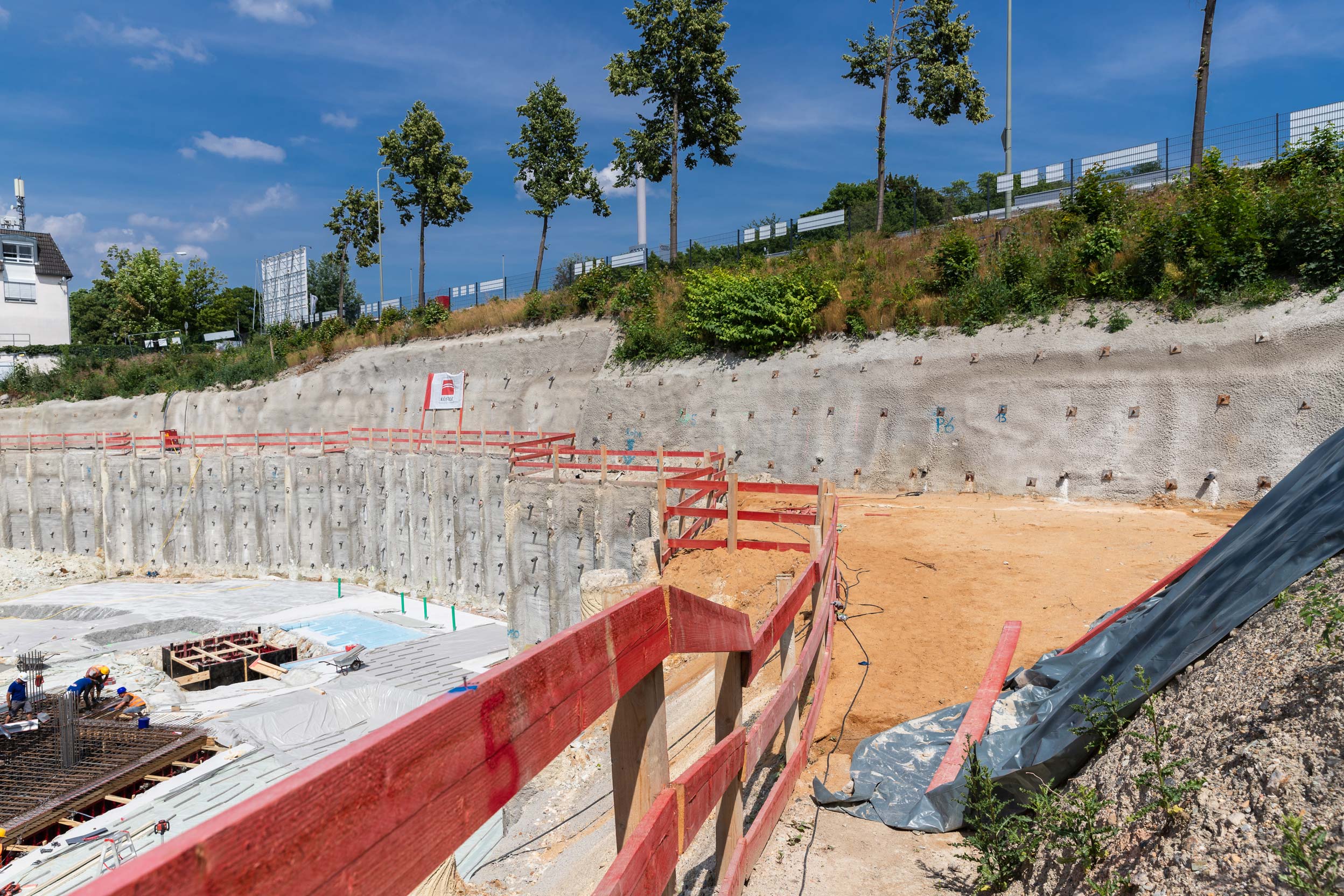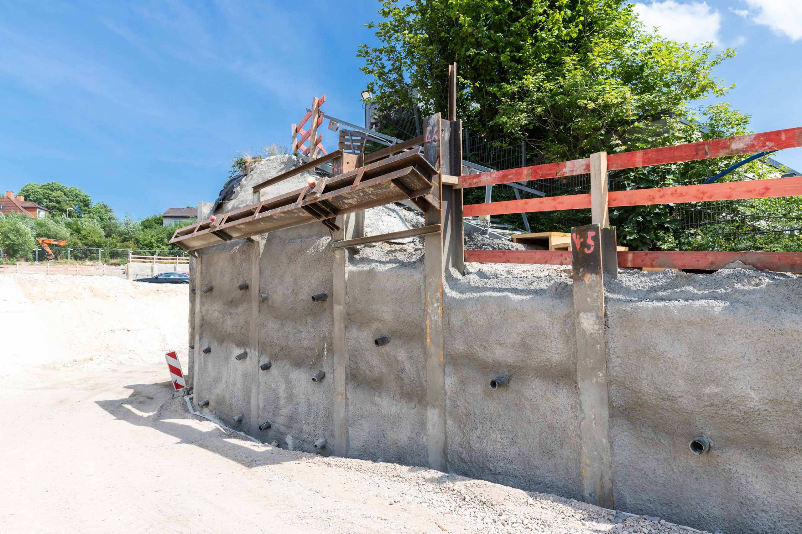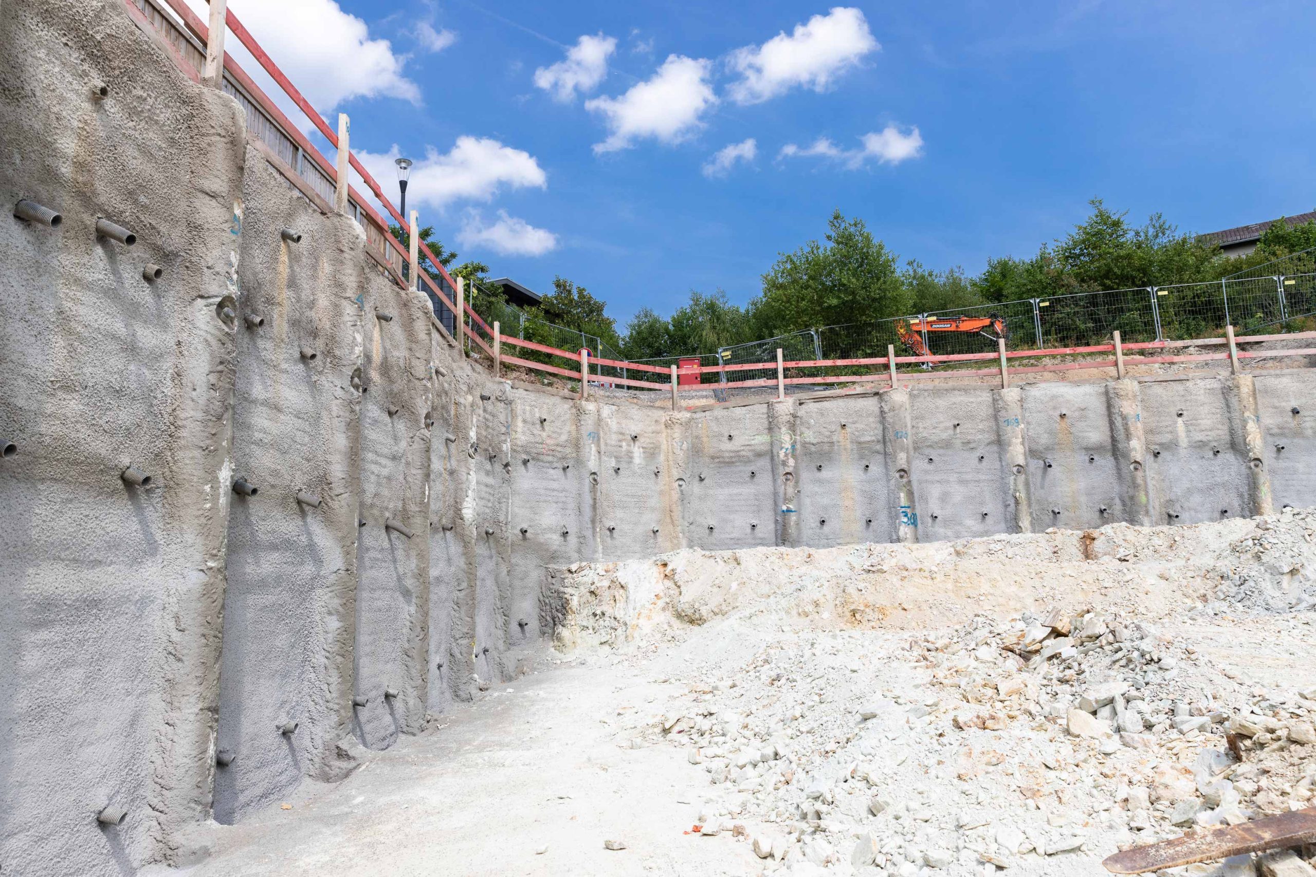 Die 9000 m² große Baugrube bedurfte einiger innovativer Ingenieurleistungen unseres Planungsteams der Abteilung Spezialtiefbau der Seidl & Partner Gesamtplanung GmbH. Basierend auf einer kompletten 3D-Planung wurde eine Hangvernagelung und eine rückverankerte Bohrpfahlwand mit Spritzbetonausfachung geplant. Am Beginn der Baugrube musste die Verbauwand auf ganz besondere Weise gestützt und konzipiert werden, um zu gewährleisten, dass der Schmutzwasserkanal auf der westlichen Seite des Quartiers weder verformt noch beschädigt wird und während der Baumaßnahmen in Betrieb bleiben kann. Die Nagelwand mit ca. 67 Laufmetern als Hangsicherung oberhalb der Pfahlwand weist eine Höhe von 3,40 m bis 5,75 m auf.