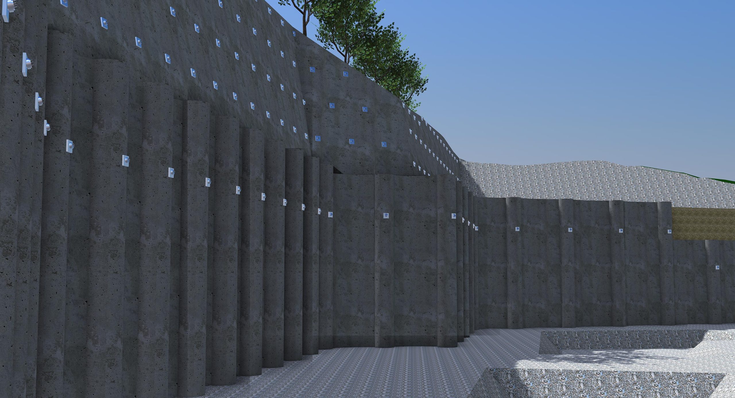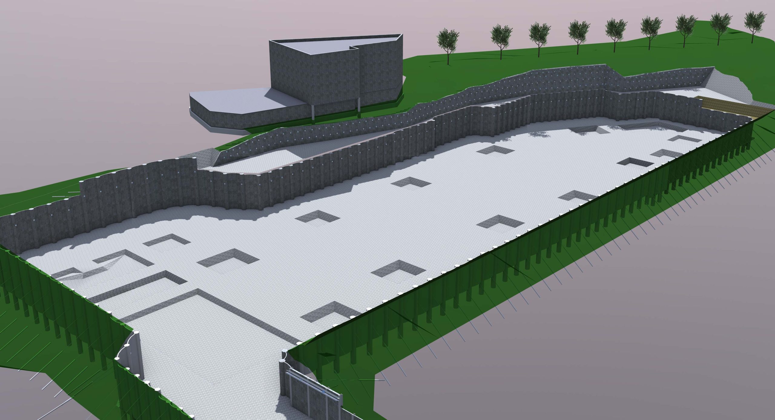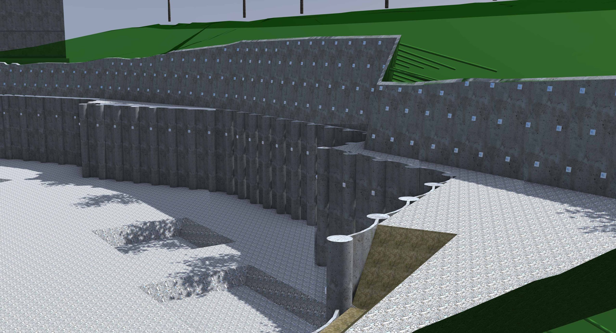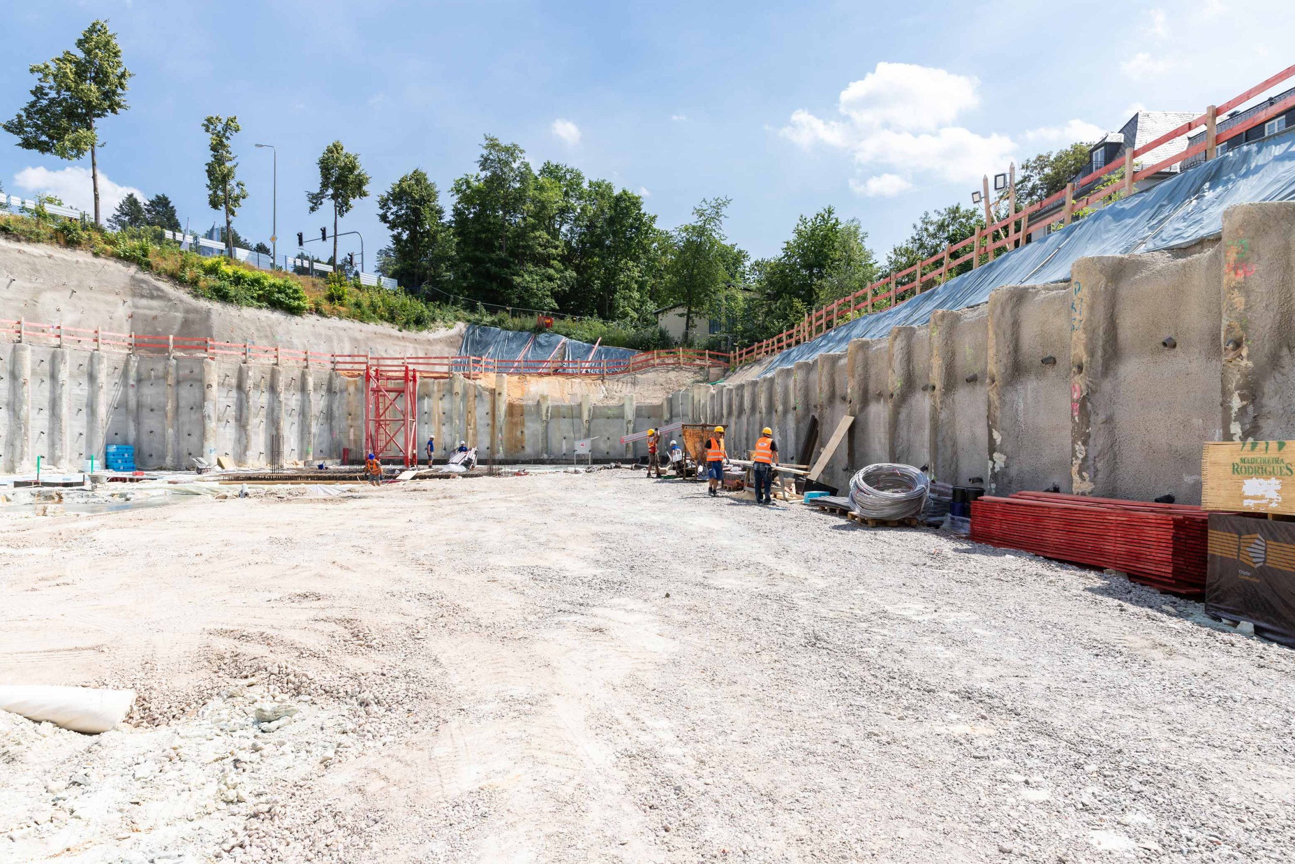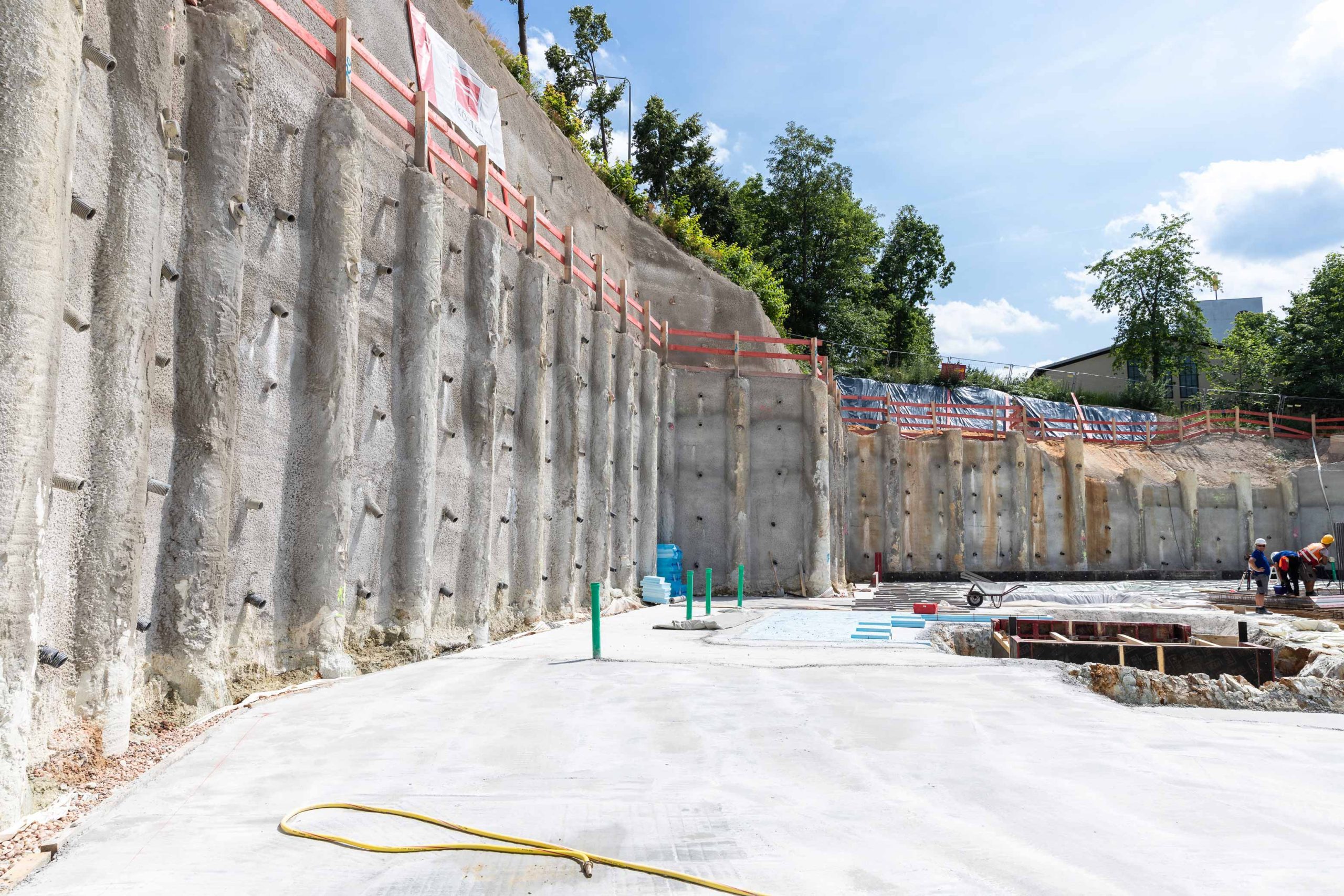 Die 9000 m² große Baugrube bedurfte einiger innovativer Ingenieurleistungen unseres Planungsteams der Abteilung Spezialtiefbau der Seidl & Partner Gesamtplanung GmbH. Basierend auf einer kompletten 3D-Planung wurde eine Hangvernagelung und eine rückverankerte Bohrpfahlwand mit Spritzbetonausfachung geplant. Am Beginn der Baugrube musste die Verbauwand auf ganz besondere Weise gestützt und konzipiert werden, um zu gewährleisten, dass der Schmutzwasserkanal auf der westlichen Seite des Quartiers weder verformt noch beschädigt wird und während der Baumaßnahmen in Betrieb bleiben kann. Die Nagelwand mit ca. 67 Laufmetern als Hangsicherung oberhalb der Pfahlwand weist eine Höhe von 3,40 m bis 5,75 m auf.