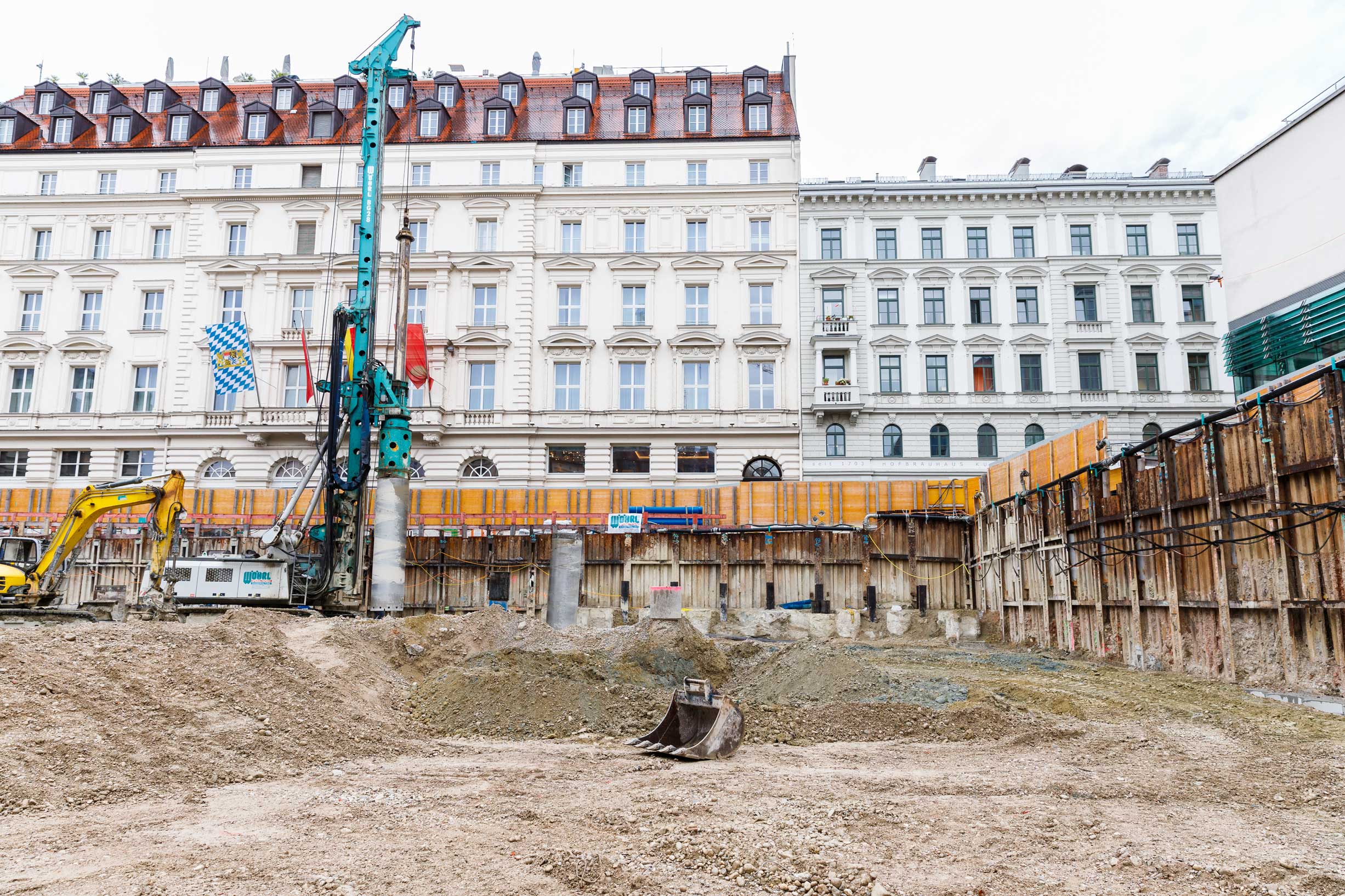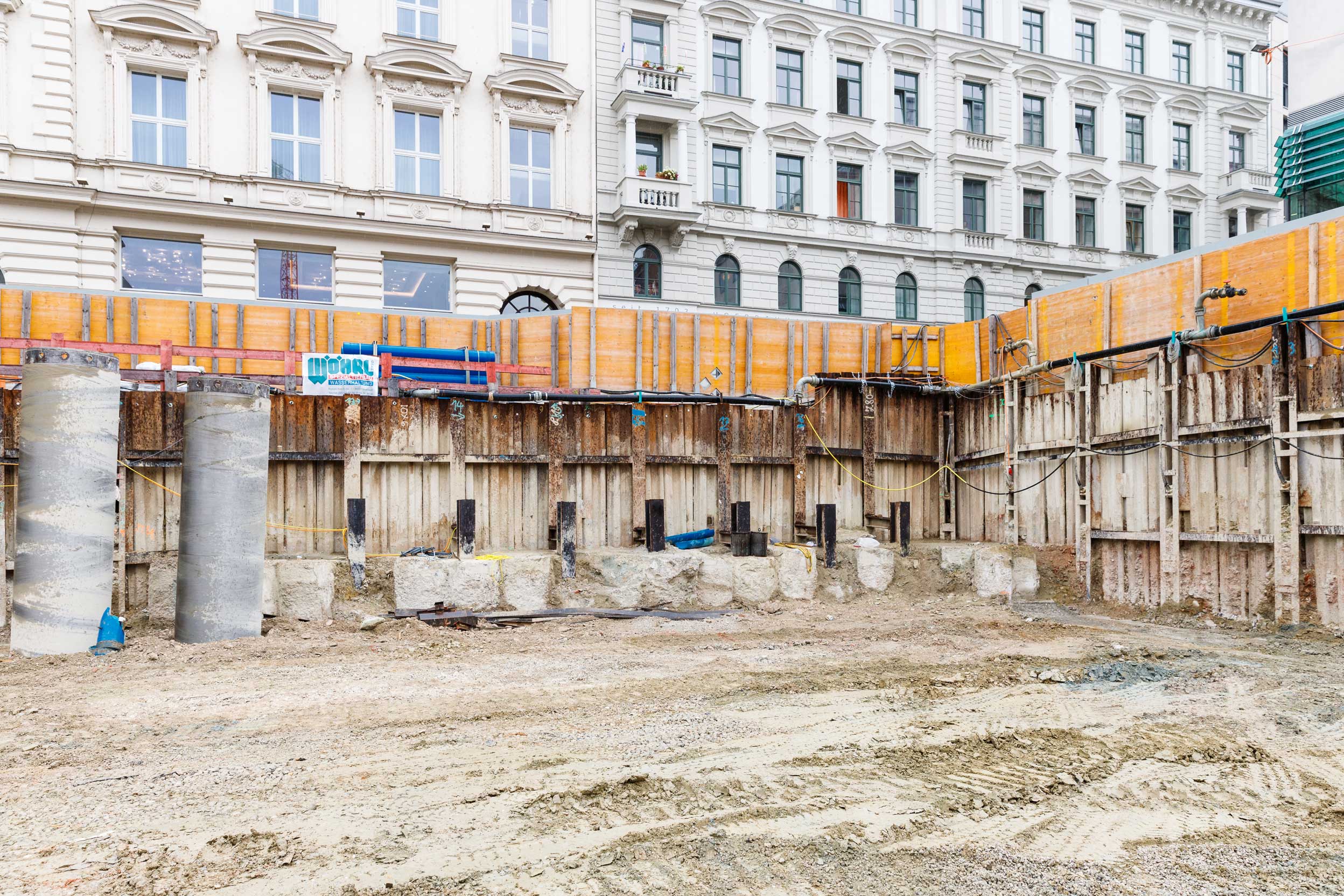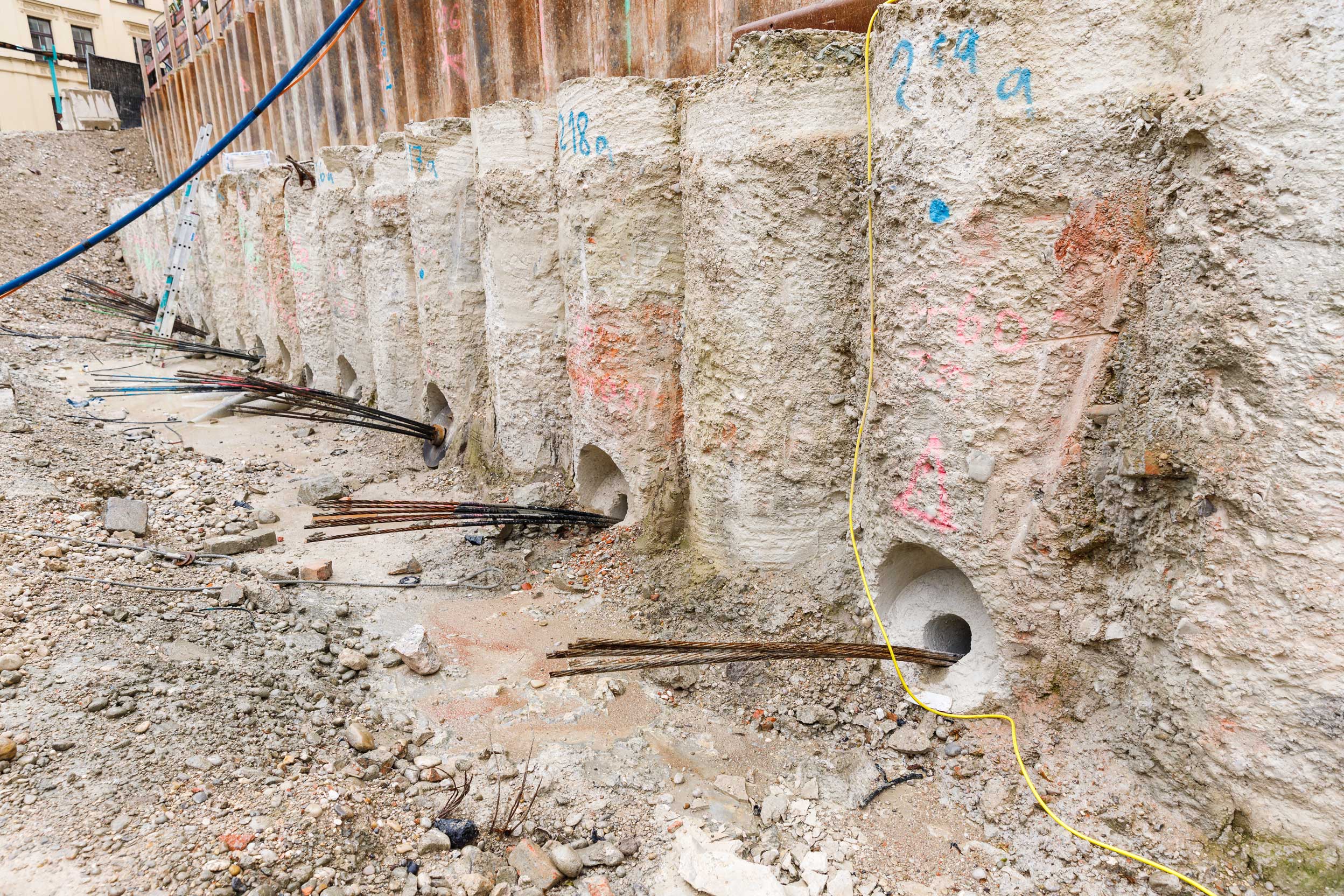 Der größte Bereich der Baugrubensohle befindet sich etwa 15 m unter der Erdoberfläche. Das aktuelle Aushubniveau liegt bei ca. 5,5 m unter Gelände. Dies ist der Übergang vom Trägerverbau (Vorverbau) zur Pfahlwand (Hauptverbau).