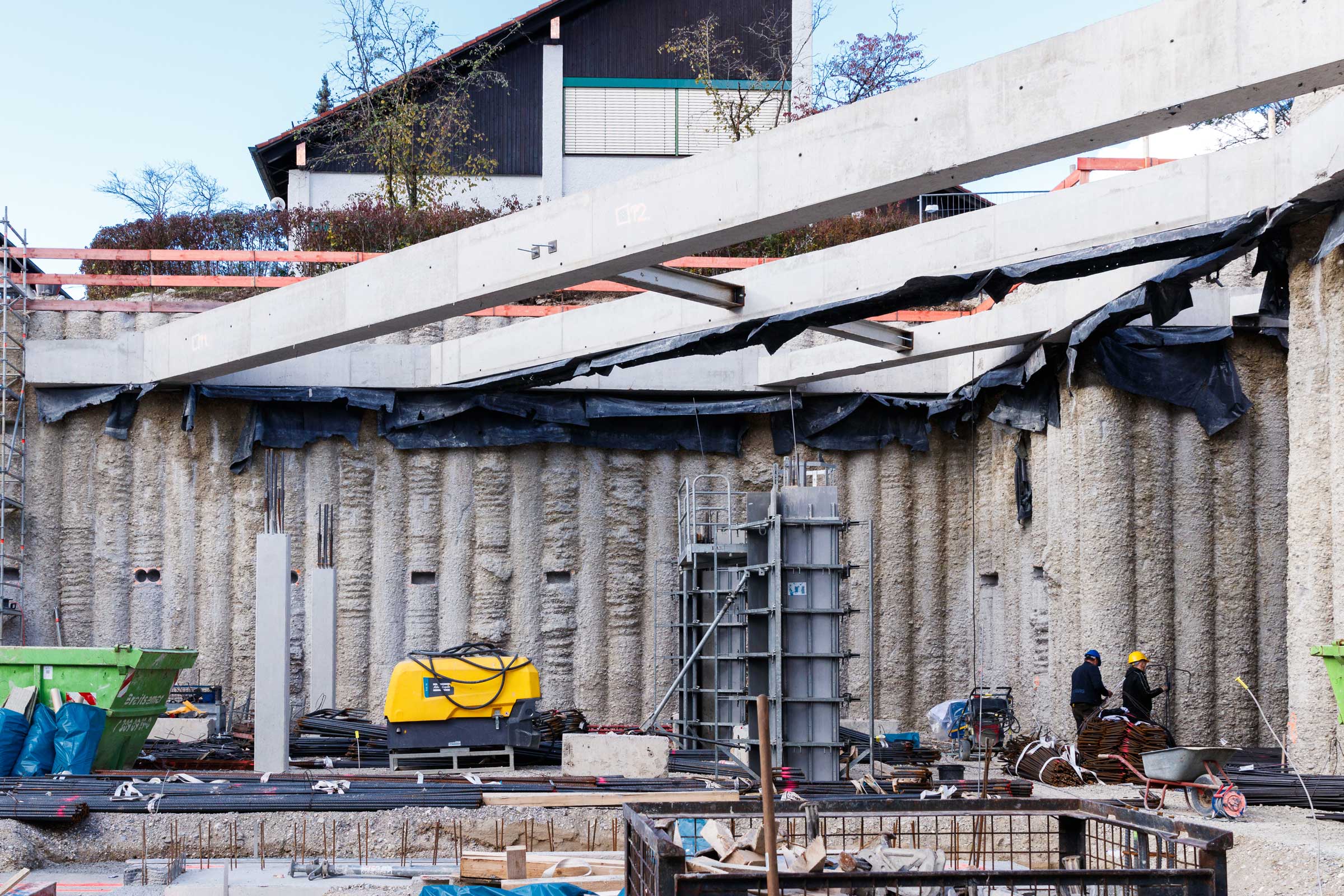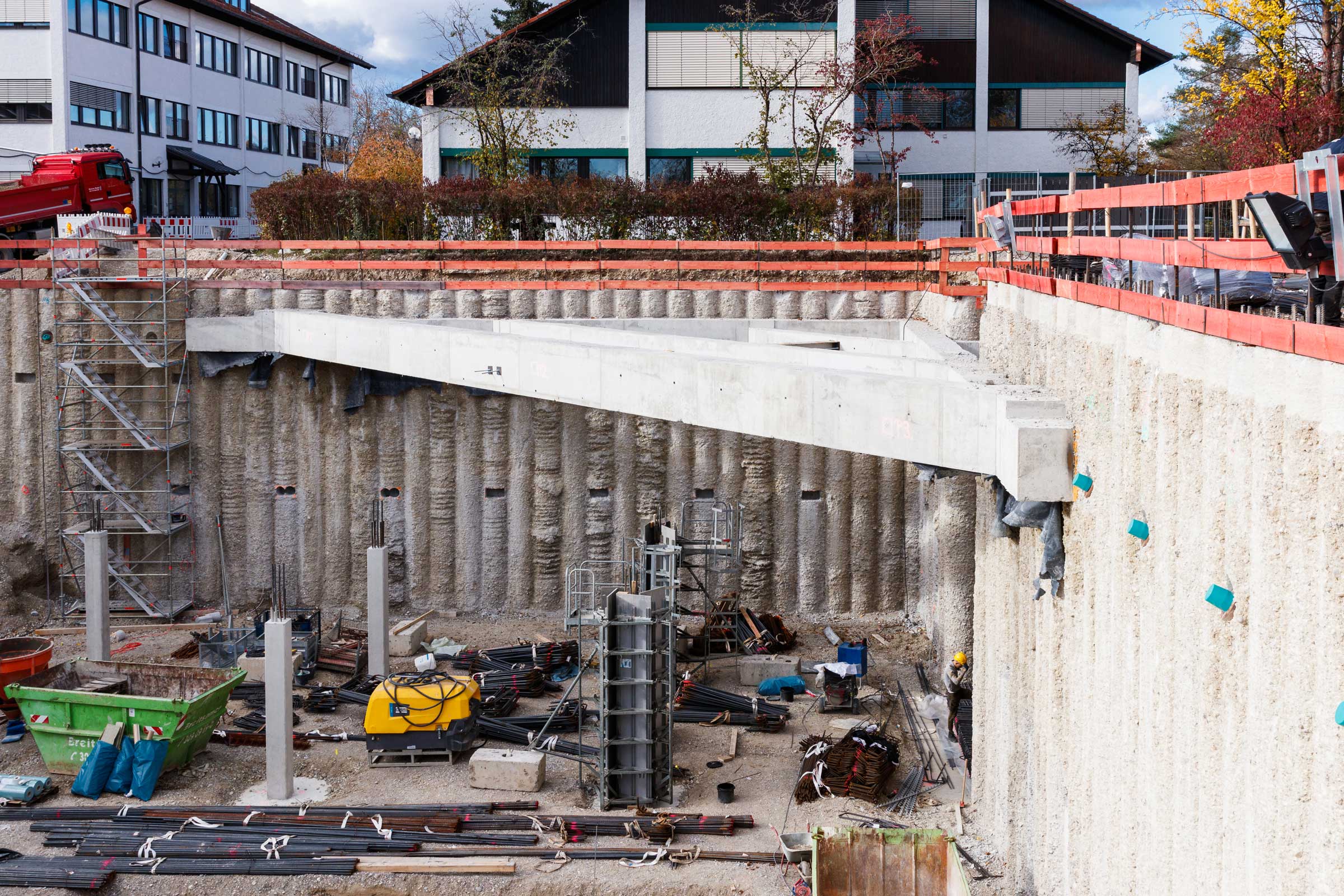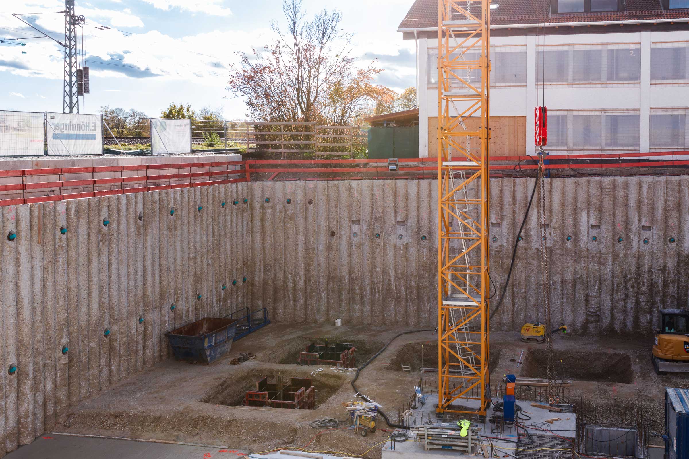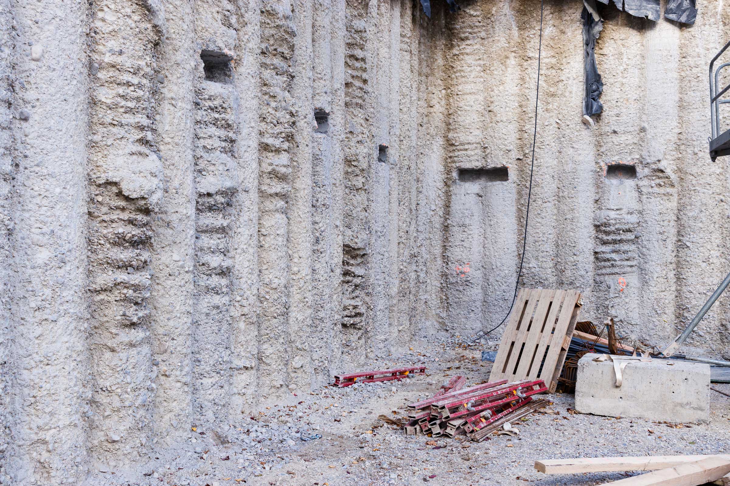 In der überschnittenen Bohrpfahlwand mit ein bis zwei Ankerlagen konnten wir bei unserem Baustellenbesuch Schlitze in regelmäßigen Abständen sehen. Diese dienen als Aufhängung für die Decken über Konsolen. Ein Hingucker bei dem Projekt ist auch die Ortbetonaussteifung.