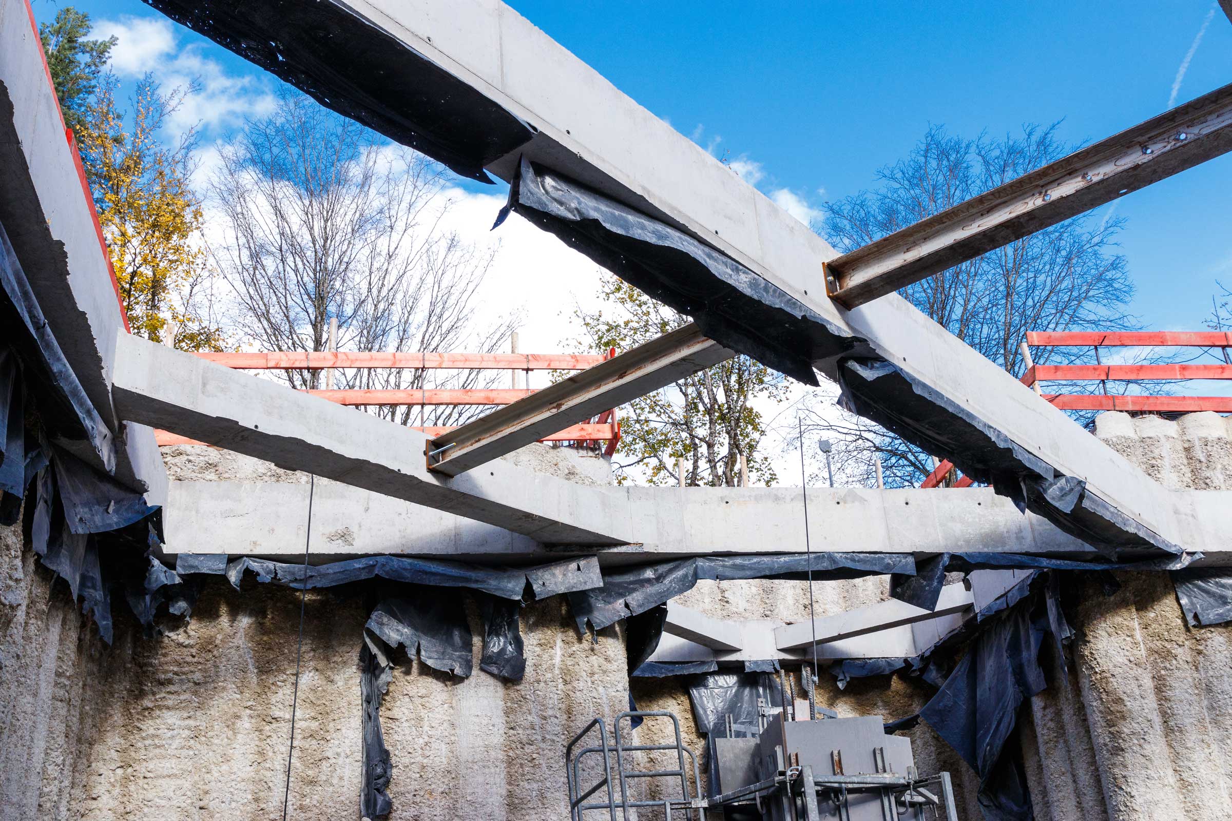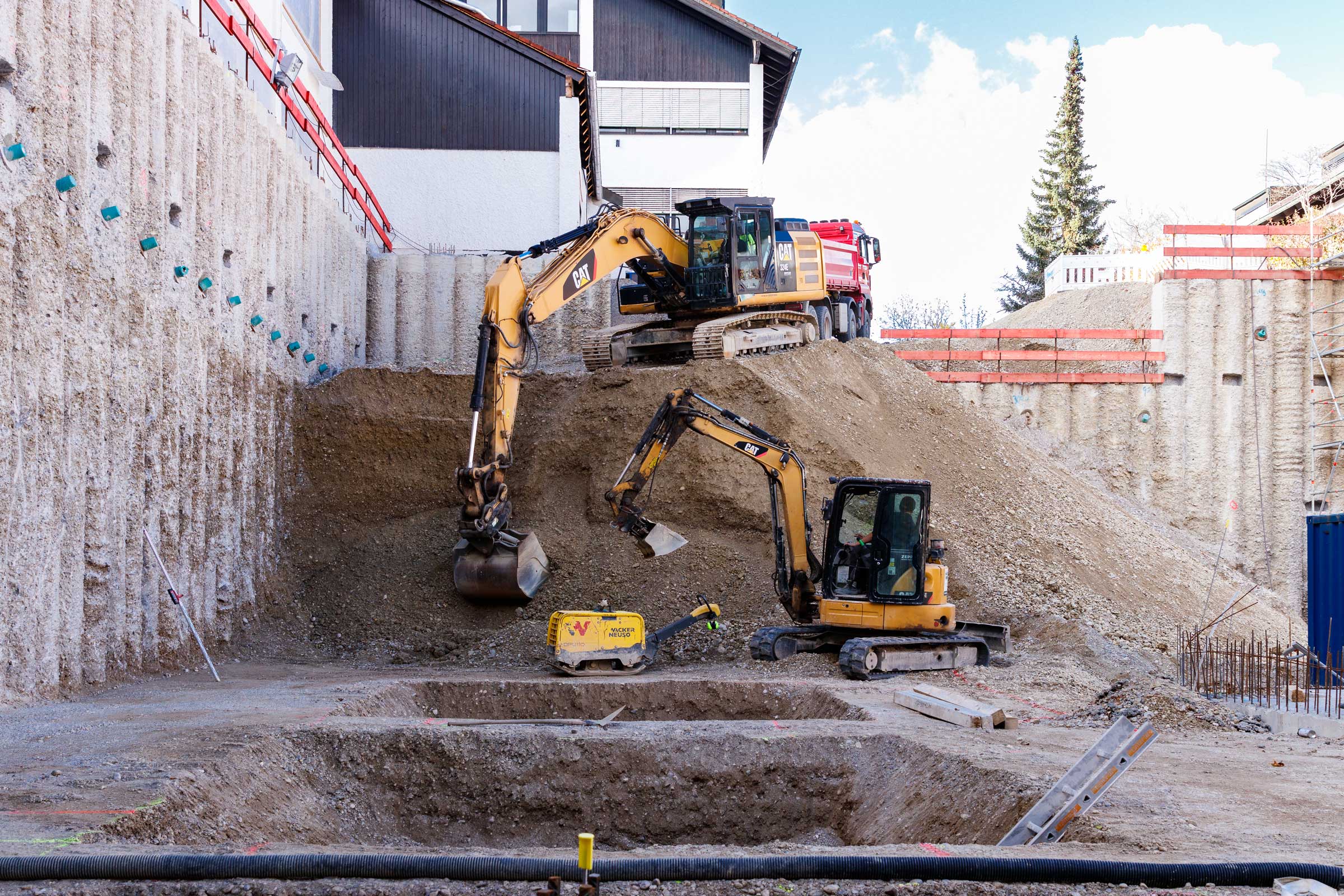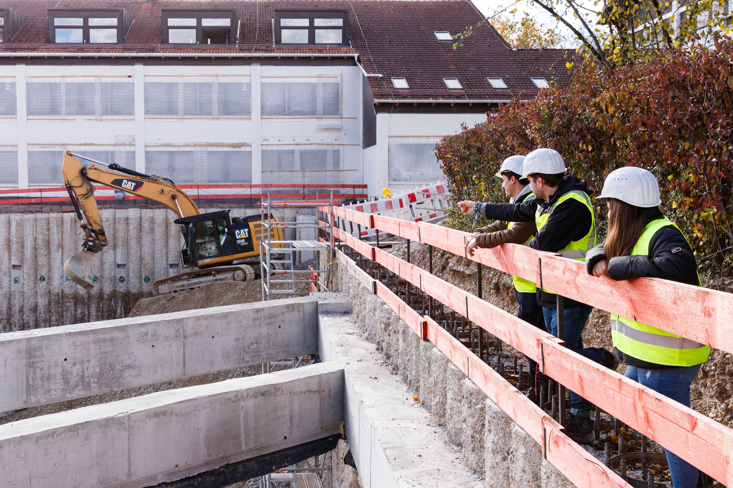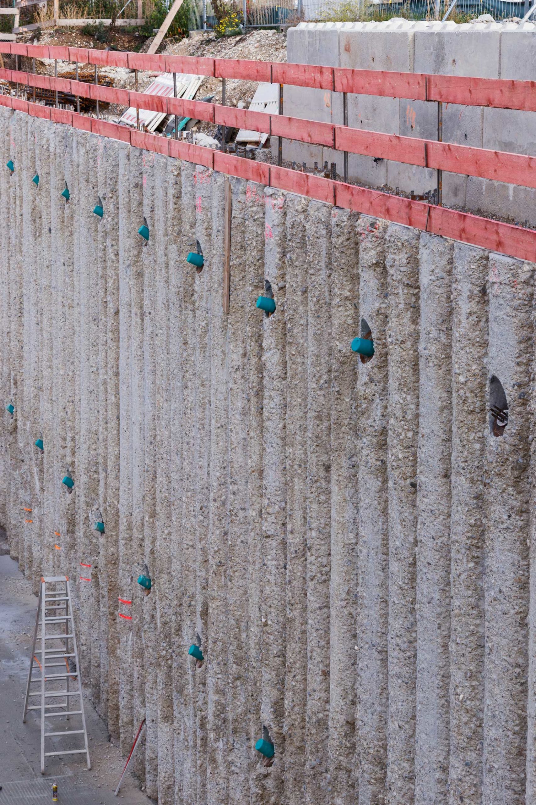 In der überschnittenen Bohrpfahlwand mit ein bis zwei Ankerlagen konnten wir bei unserem Baustellenbesuch Schlitze in regelmäßigen Abständen sehen. Diese dienen als Aufhängung für die Decken über Konsolen. Ein Hingucker bei dem Projekt ist auch die Ortbetonaussteifung.