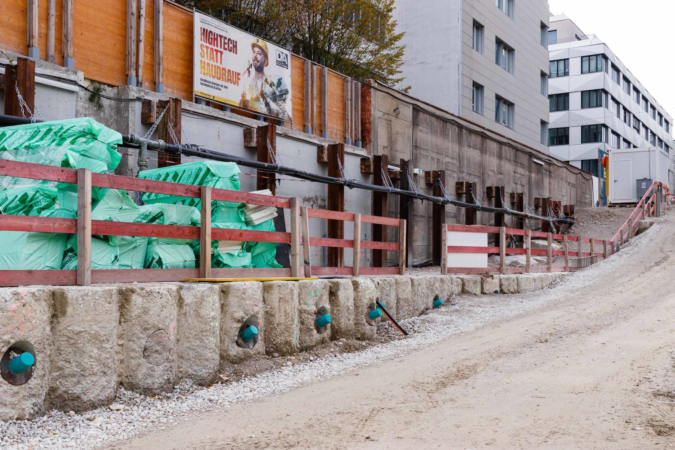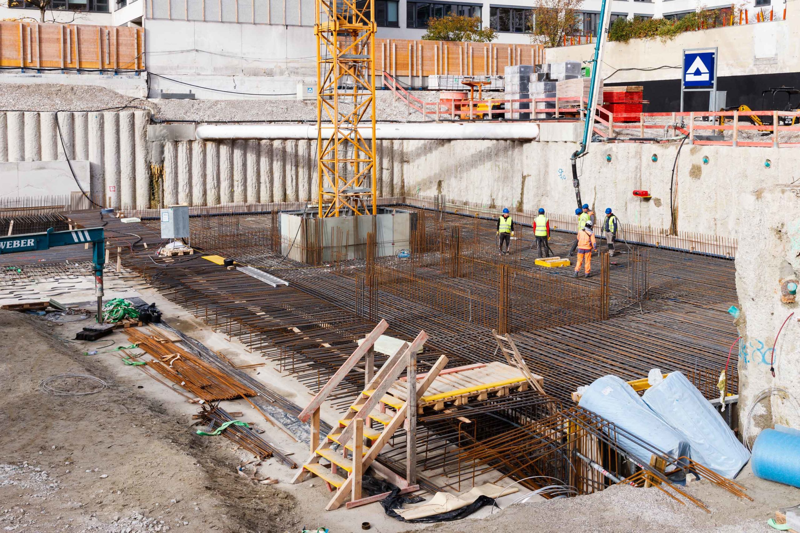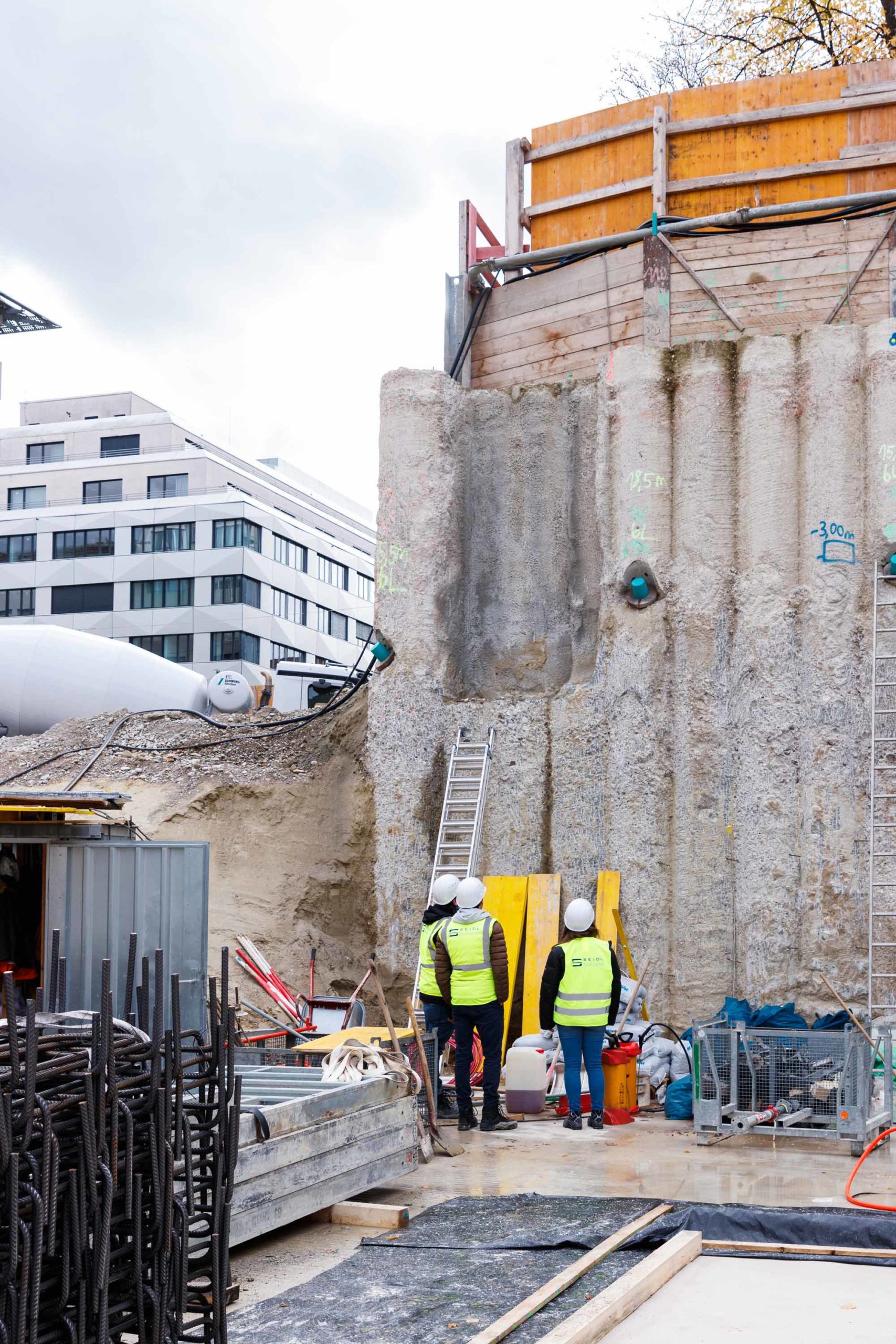 Als Baugrubensicherung kommt eine überschnittene Bohrpfahlwand mit teilweise freistehenden sowie rückverankerten und bereichsweise ausgesteiften Bereichen zum Einsatz. Entlang der Baugrube befinden sich umlaufend angrenzende Gebäude, die bei der Planung des Verbaus entsprechend einberechnet und abgesichert werden mussten. Bei der Planung musste statisch berücksichtigt werden, dass unter dem Baufeld die Tunnel der U4 und der U5 kreuzen. Auch der Fluchtweg eines hinter dem Baufeld liegenden Nachbargebäudes wird bauzeitlich mittels eines an Steckträgern aufgehängten Gerüststeges aufrechterhalten.