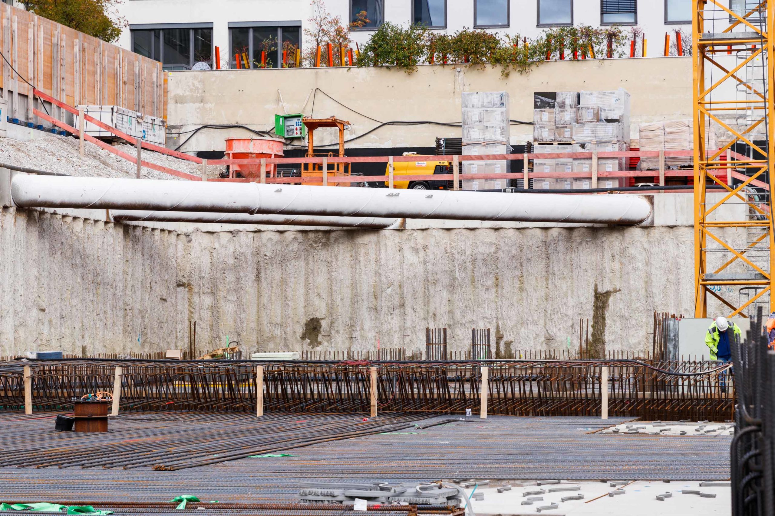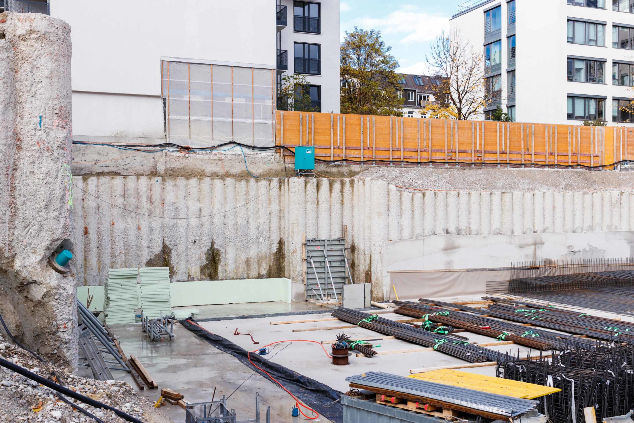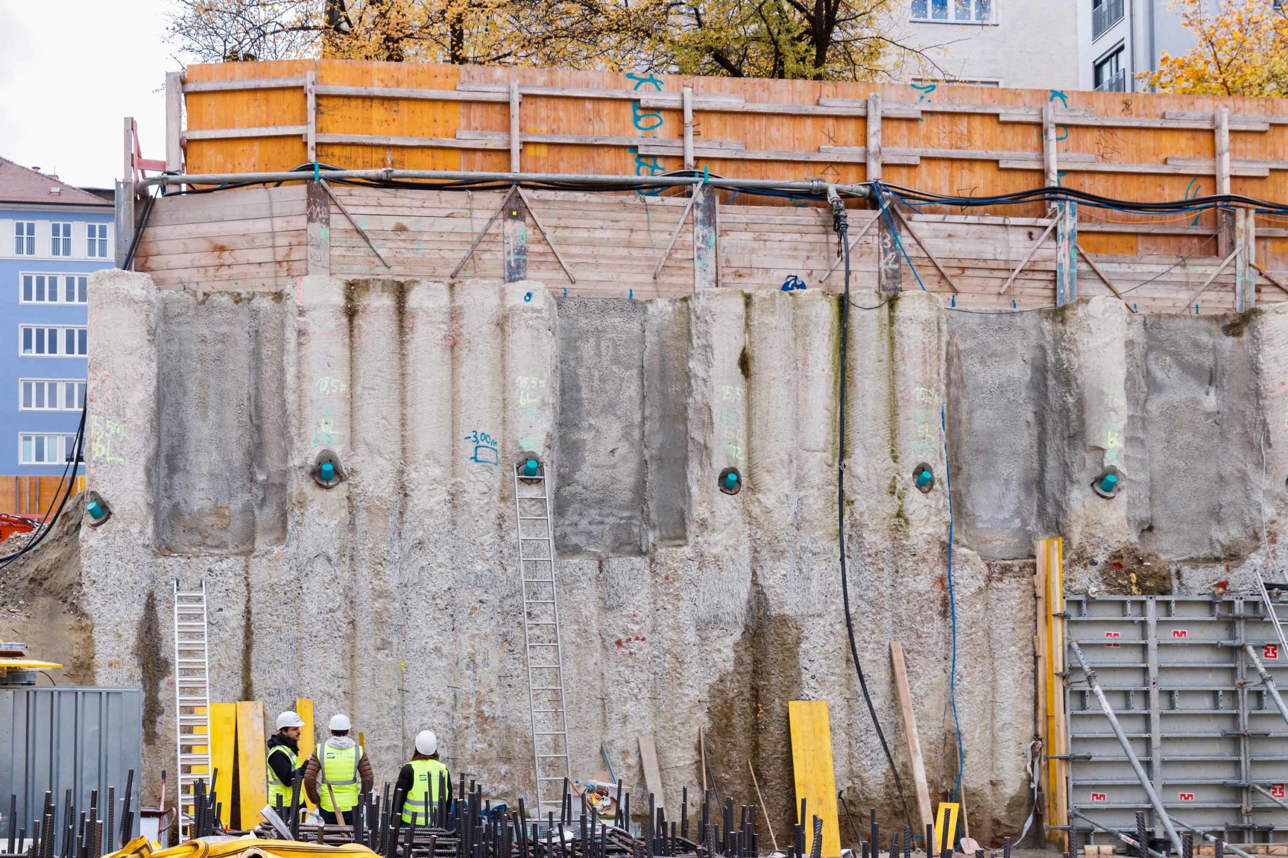 Als Baugrubensicherung kommt eine überschnittene Bohrpfahlwand mit teilweise freistehenden sowie rückverankerten und bereichsweise ausgesteiften Bereichen zum Einsatz. Entlang der Baugrube befinden sich umlaufend angrenzende Gebäude, die bei der Planung des Verbaus entsprechend einberechnet und abgesichert werden mussten. Bei der Planung musste statisch berücksichtigt werden, dass unter dem Baufeld die Tunnel der U4 und der U5 kreuzen. Auch der Fluchtweg eines hinter dem Baufeld liegenden Nachbargebäudes wird bauzeitlich mittels eines an Steckträgern aufgehängten Gerüststeges aufrechterhalten.