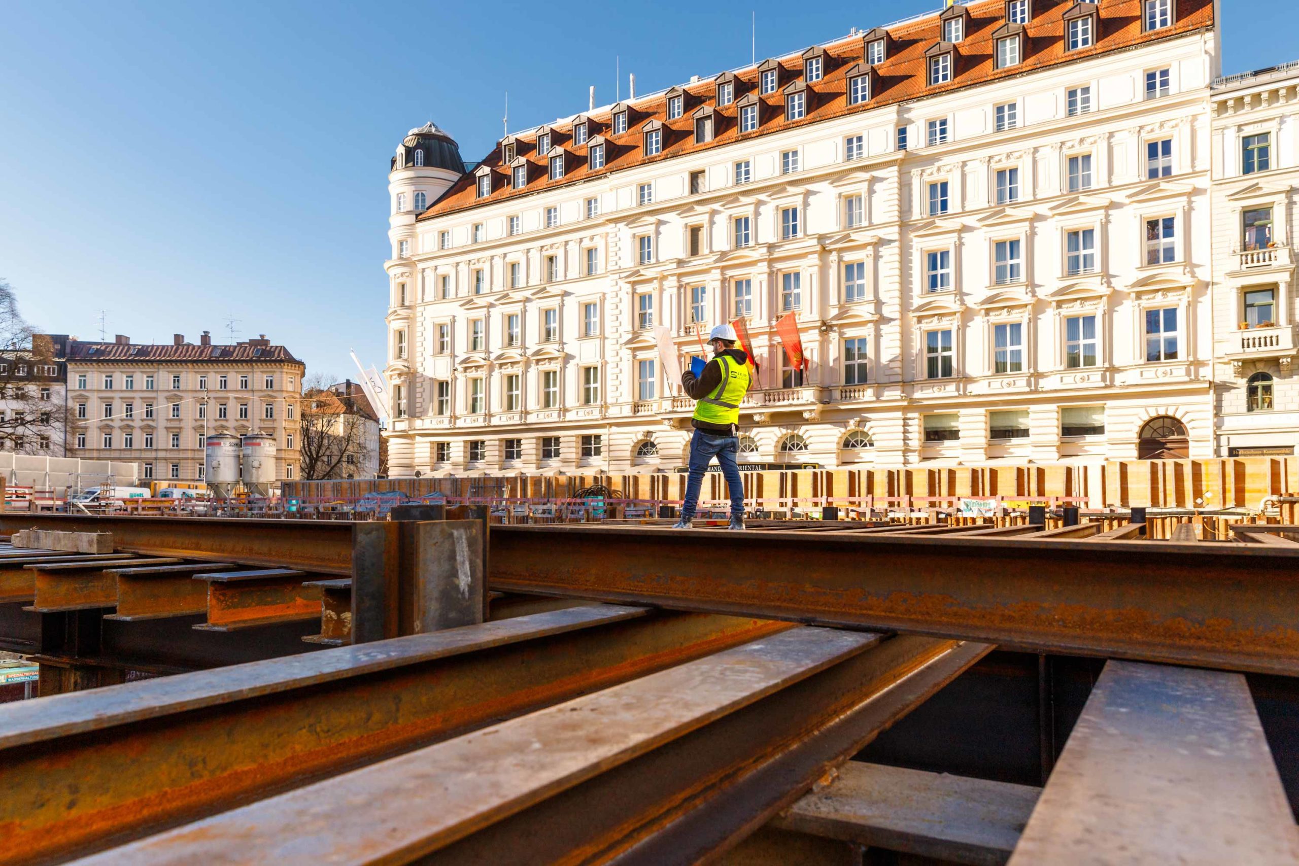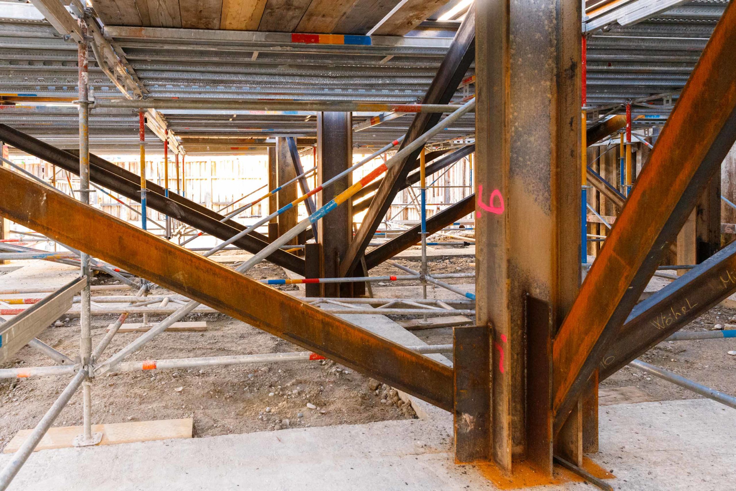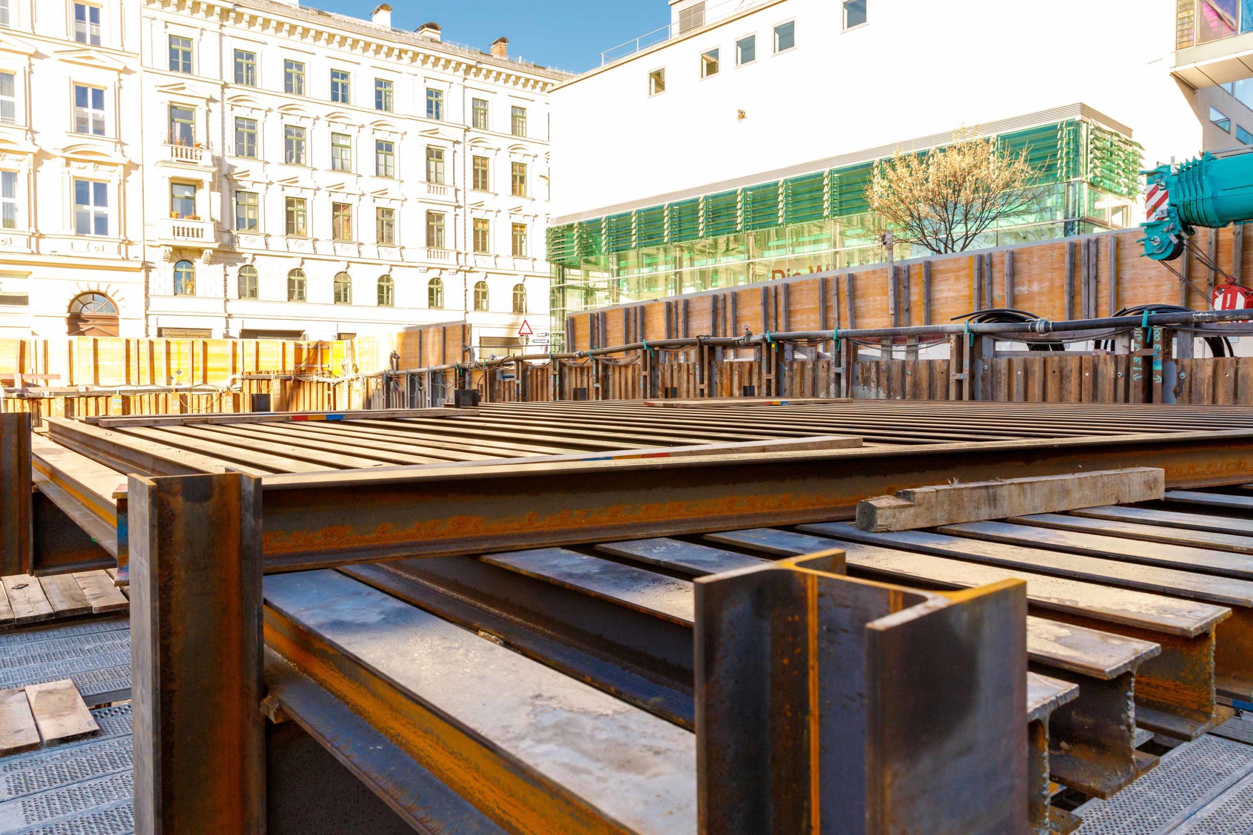 Die beengten Platzverhältnisse der innerstädtischen Baugrube forderten innovative Ideen. Da es rund um das Baufeld keine geeigneten Aufstellflächen für Kran, Bagger und Betonpumpen gibt, soll zur logistischen Erschließung des Baugeländes eine Logistikplattform über der Baugrube erstellt werden. Unsere Ingenieurleistung ist in diesem Bauteil aufgrund einer Kombination aus einem Betonbalkenrost, dem darüberliegenden Stahlbau und einer Fahrbahnplatte aus Stahlbeton statisch sehr komplex. Die Plattform wird mit der Betonage der Fahrbahnplatte und der Montage der Geländer in wenigen Wochen fertiggestellt, sodass der weitere Baugrubenaushub bald darüber abgewickelt werden kann. Sobald die Kellergeschosse fertig errichtet sind, wird die Logistikplattform dann Stück für Stück wieder abgebrochen.
