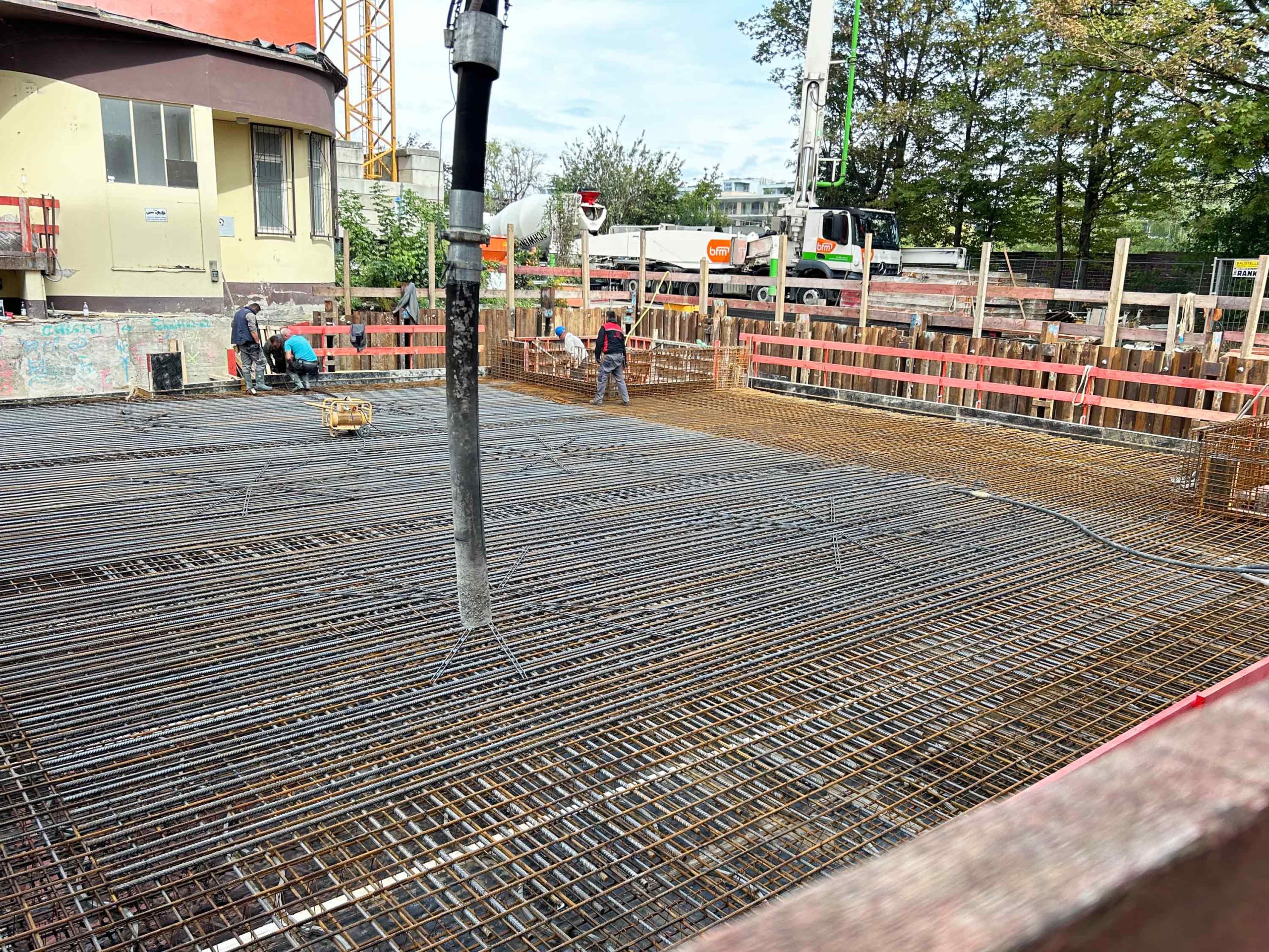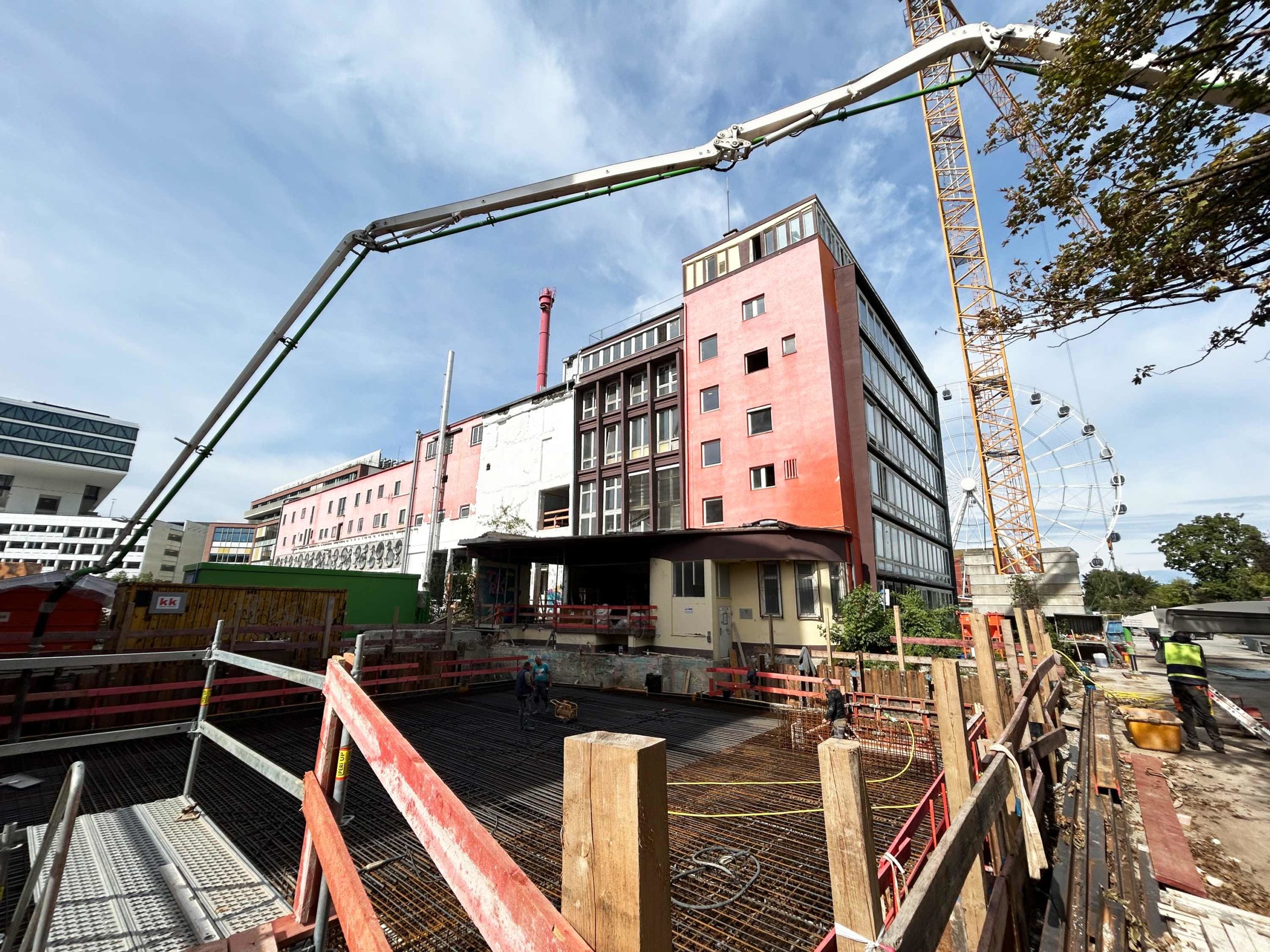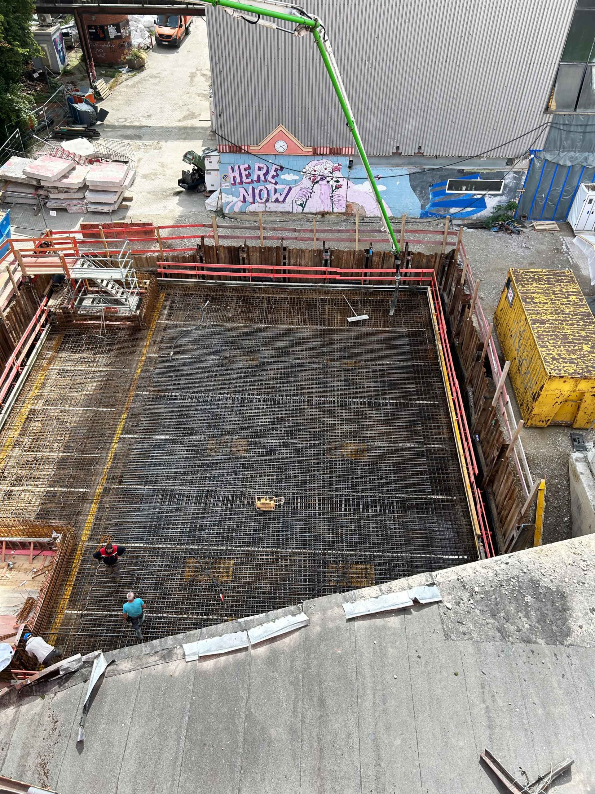 Unsere Mitarbeiter:innen waren vor Ort, als der Batteriespeicher fast fertiggestellt war und die letzten Vorbereitungen für die Betonage der Decke getroffen wurden. Die Betonage sollte mit einer Betonpumpe erfolgen. Außerdem war der Abbruch für den Treppenhauskern in vollem Gange, denn der Wiederaufbau des Treppenhauses ist der nächste Punkt auf der Agenda.
