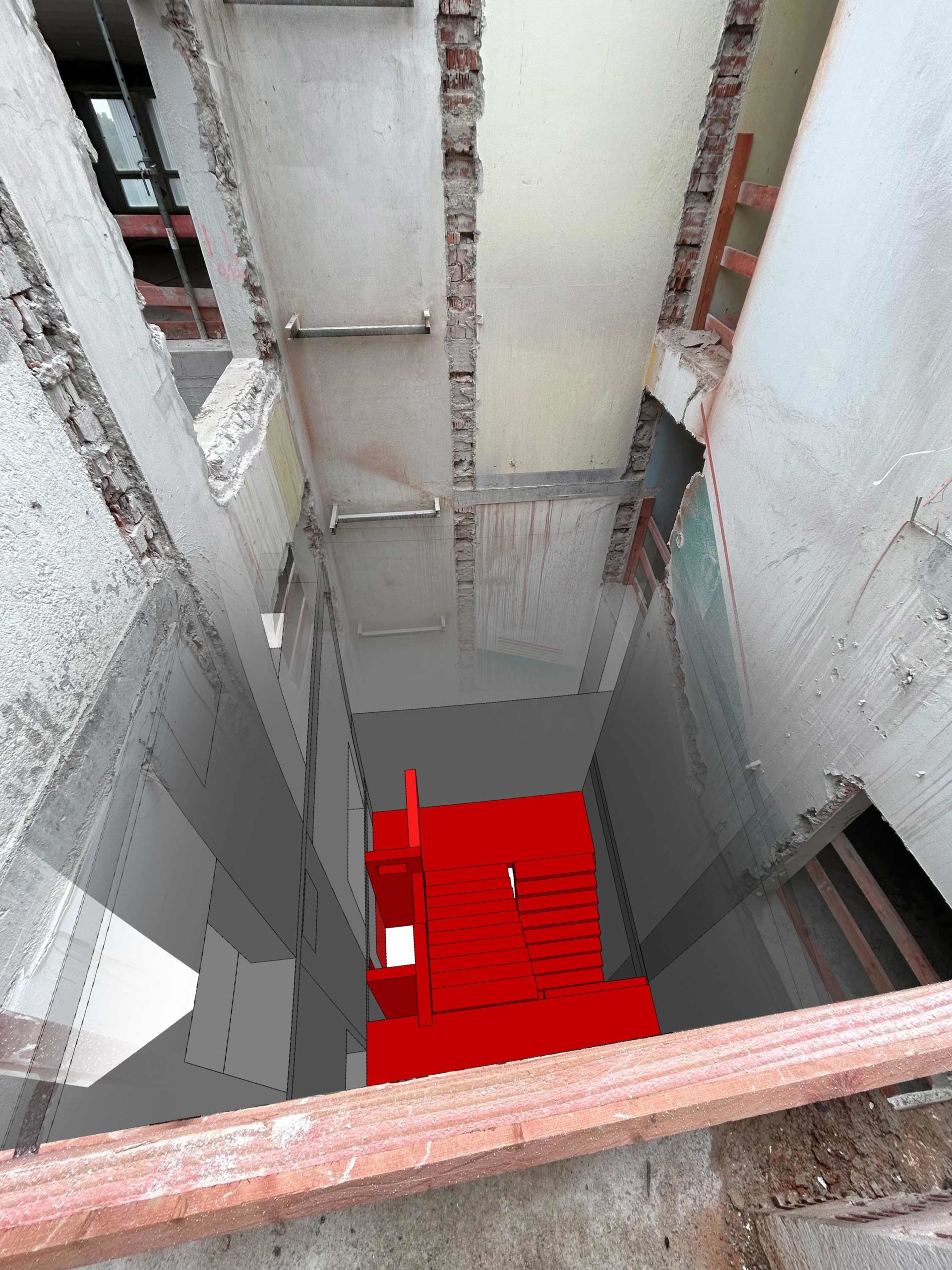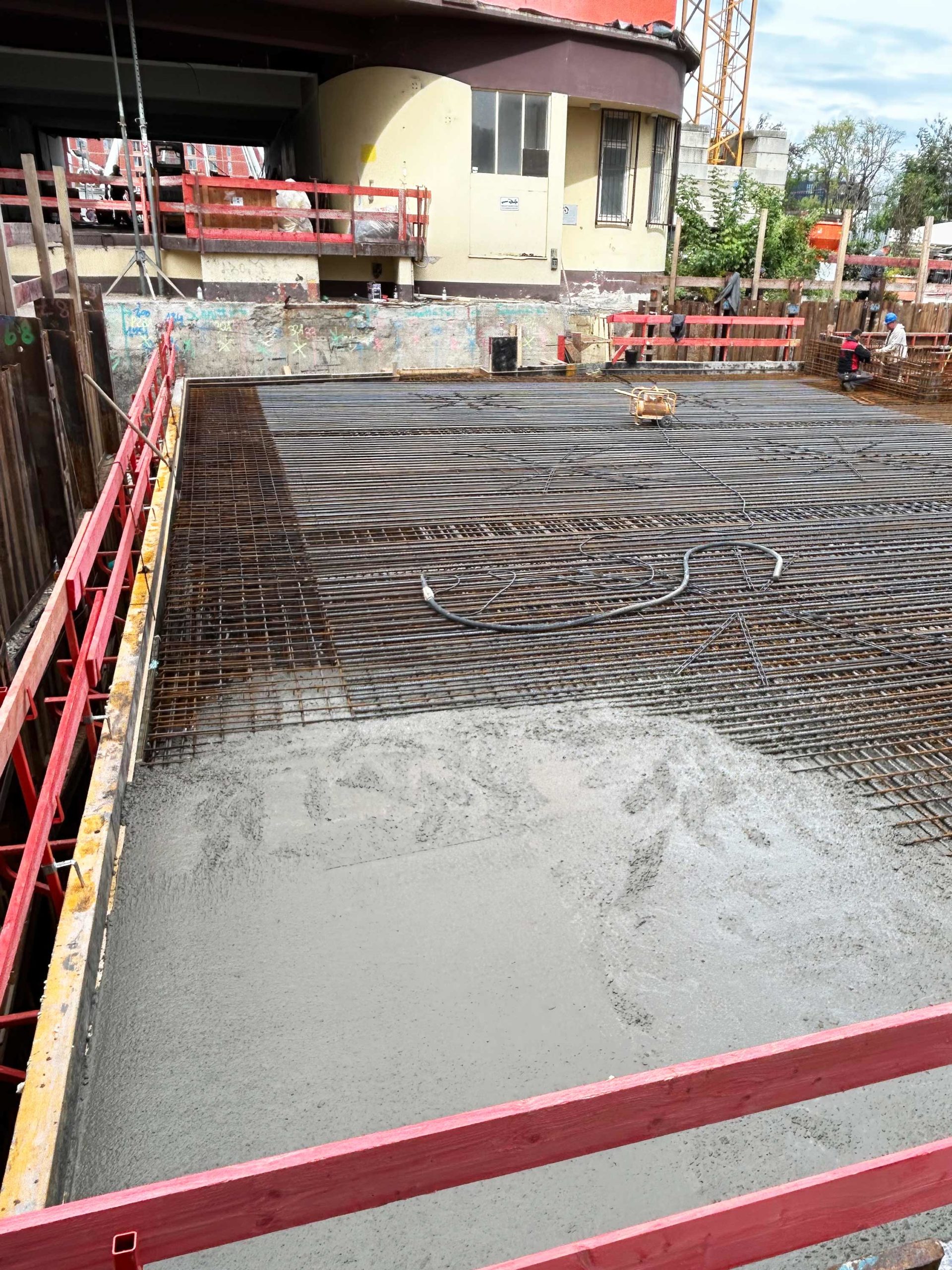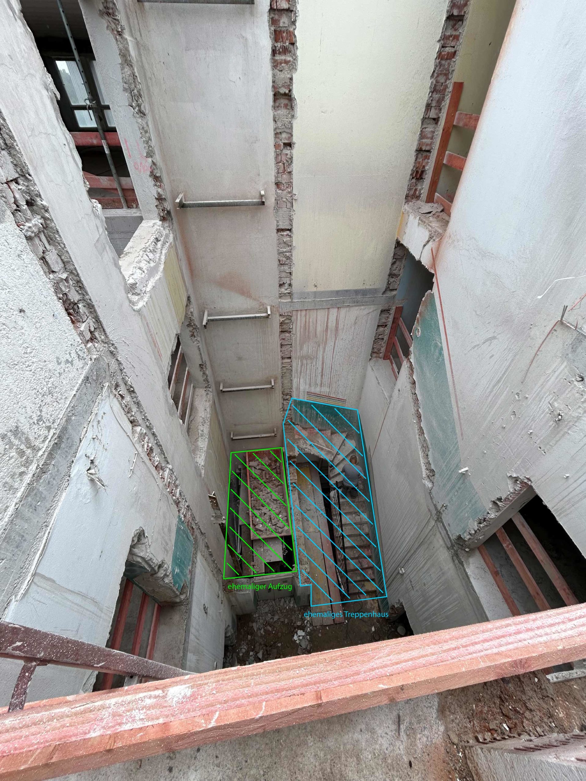Unsere Mitarbeiter:innen waren vor Ort, als der Batteriespeicher fast fertiggestellt war und die letzten Vorbereitungen für die Betonage der Decke getroffen wurden. Die Betonage sollte mit einer Betonpumpe erfolgen. Außerdem war der Abbruch für den Treppenhauskern in vollem Gange, denn der Wiederaufbau des Treppenhauses ist der nächste Punkt auf der Agenda.