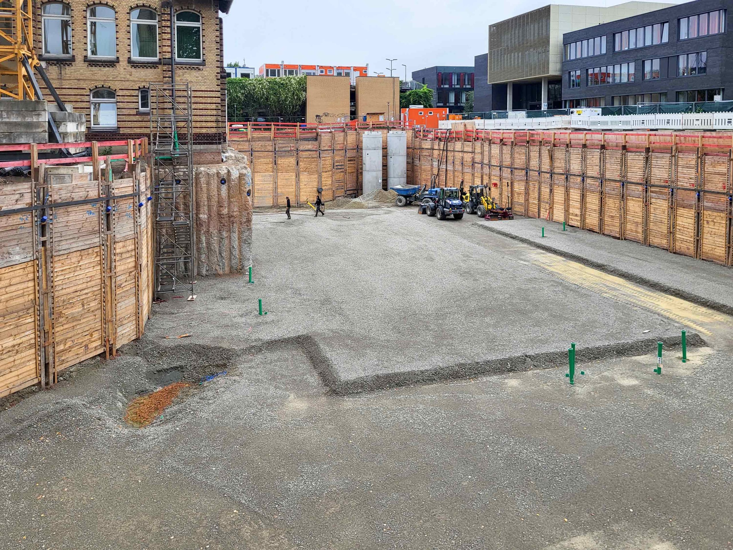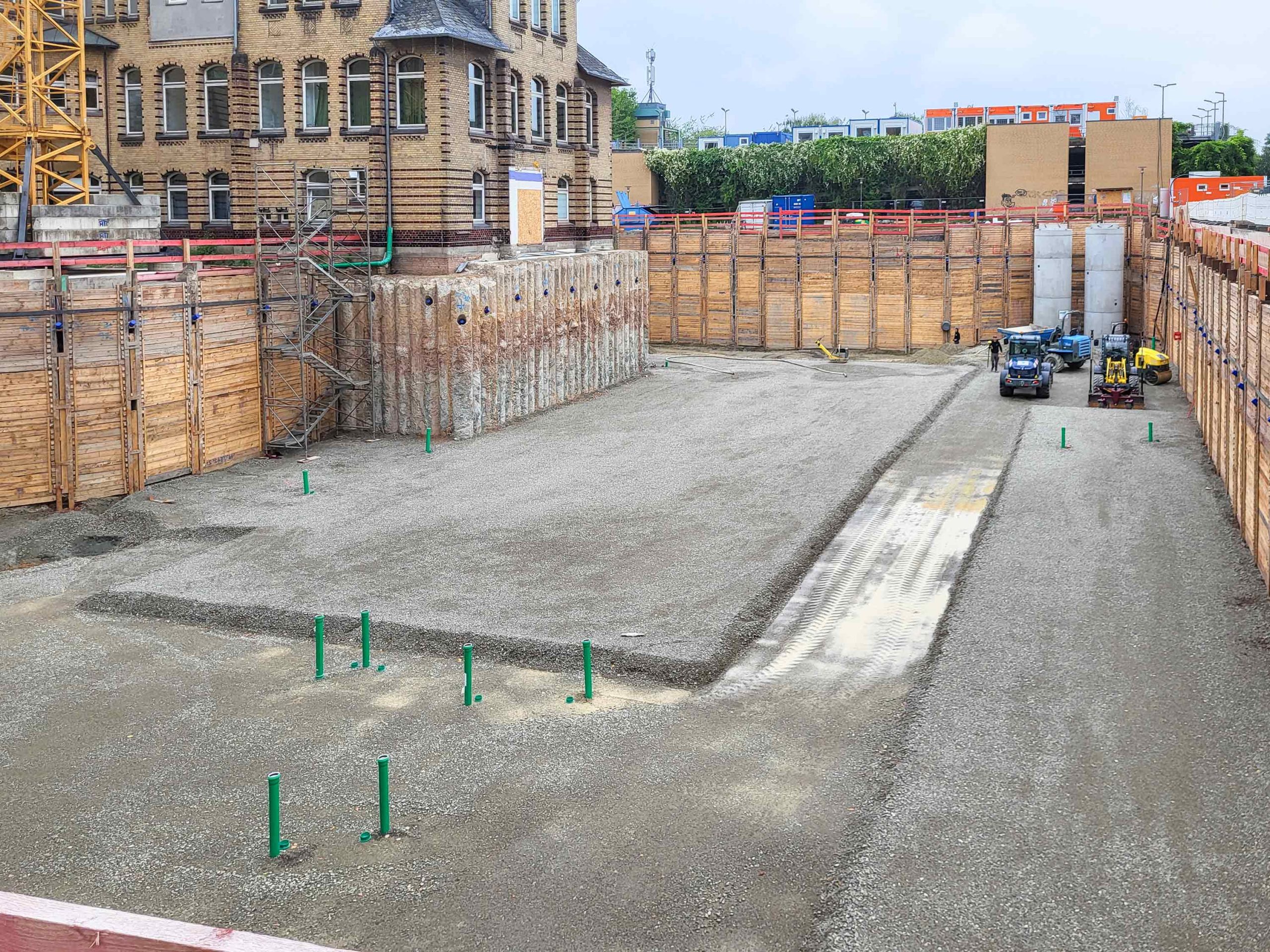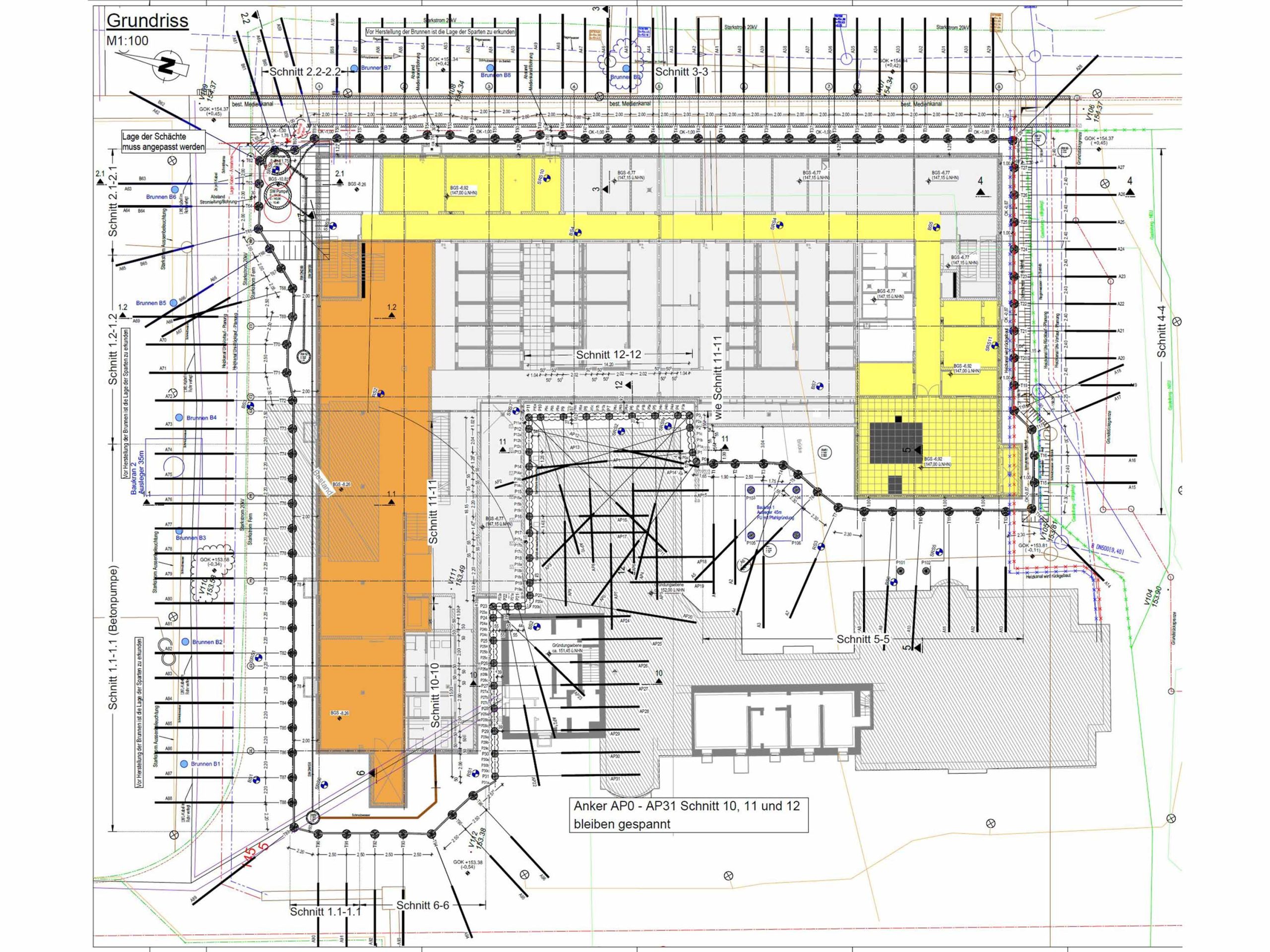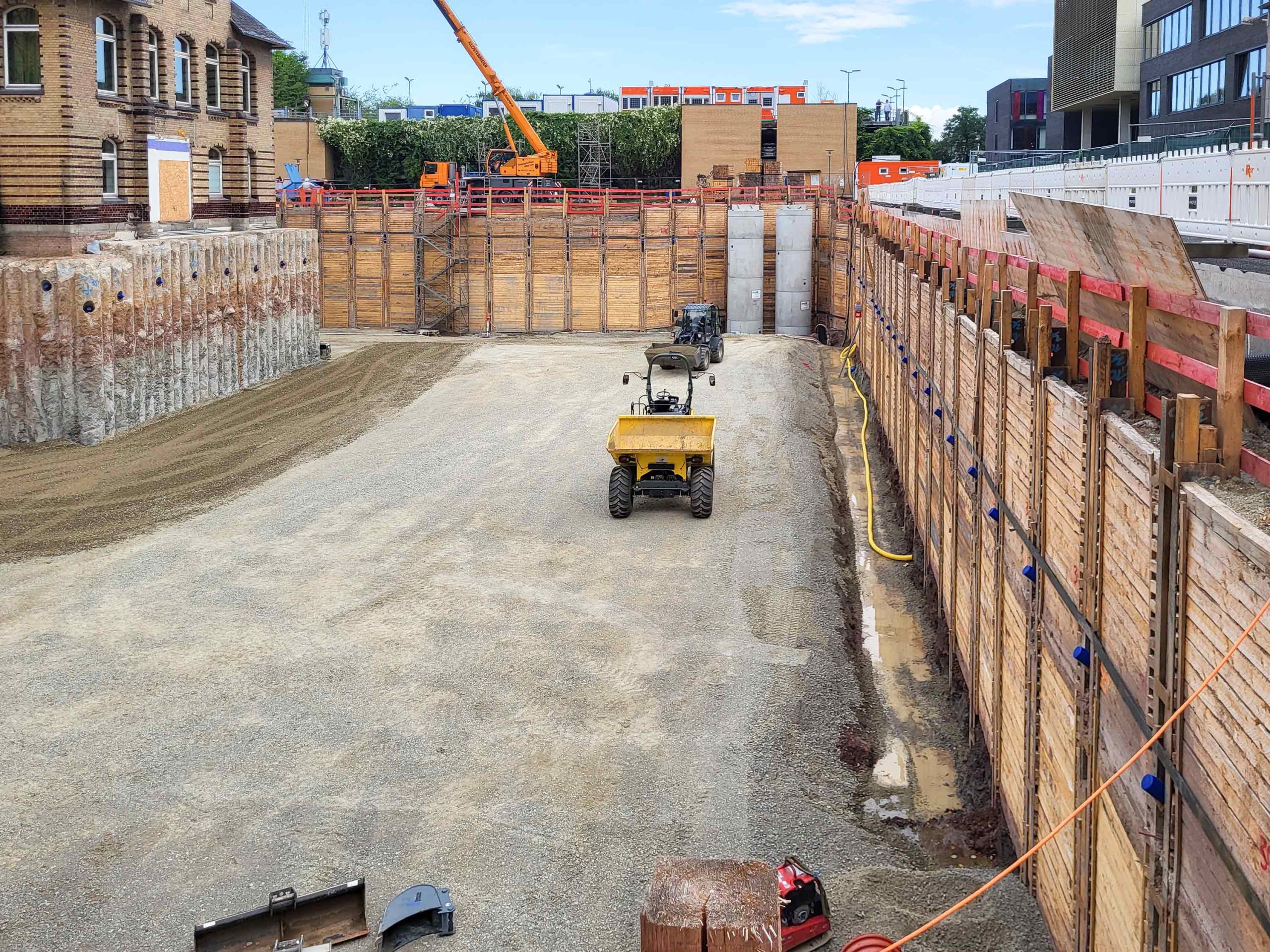 Da die Bohrpfahlwand unmittelbar vor dem Bestandsgebäude geplant war, galt es für unsere Ingenieur:innen und Konstrukteur:innen der Abteilung Spezialtiefbau, den Bestand mit Ankern um das gesamte Gebäude herum zu sichern. Damit auch zukünftig keine Verformungen auftreten, werden die Anker in der Bohrpfahlwand am Bestand gespannt bleiben. Die übrigen Bereiche wurden mit einer verankerten Trägerbohlwand gesichert. Der Kran, der direkt hinter dem Verbau errichtet werden sollte, wurde auf vier eigenen Pfählen gegründet, sodass seine Last nicht auf die umliegenden Flächen wirken konnte.