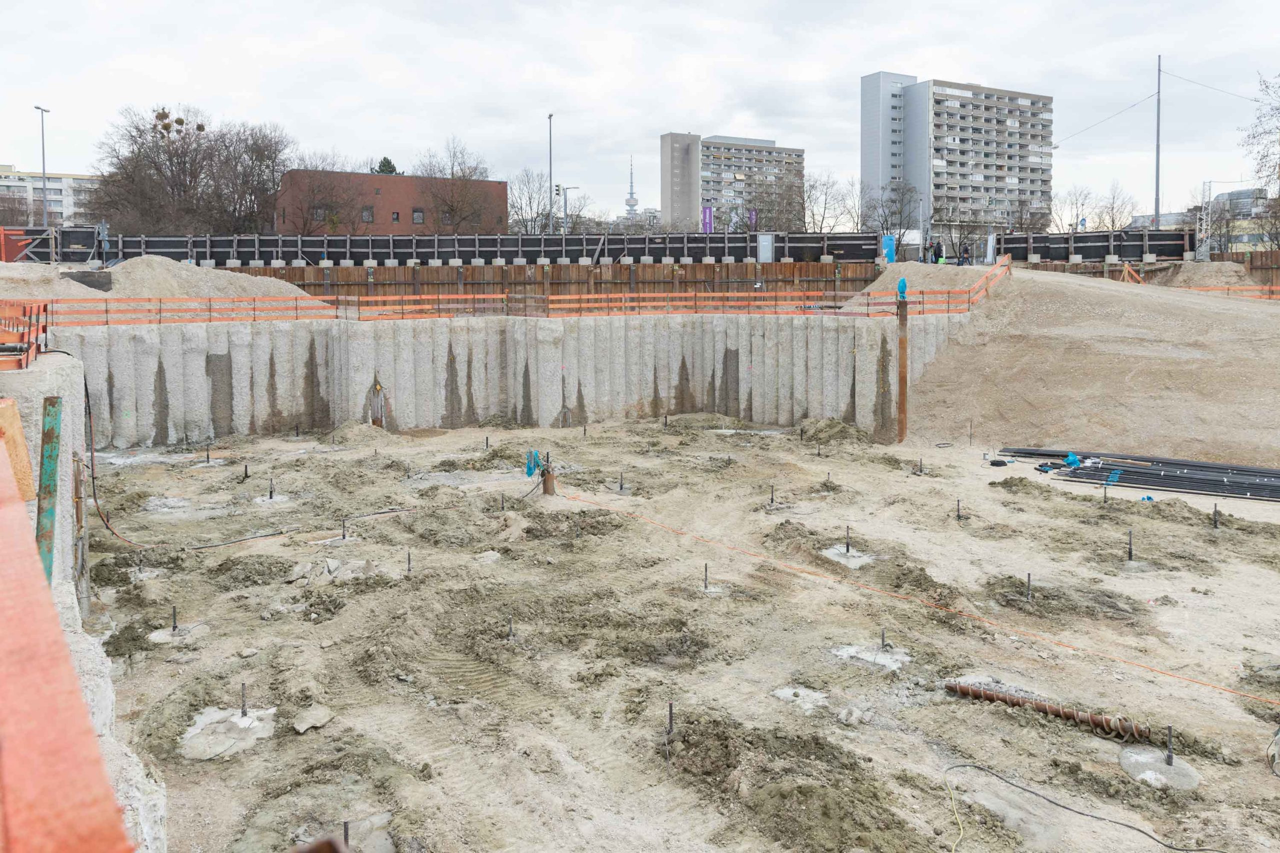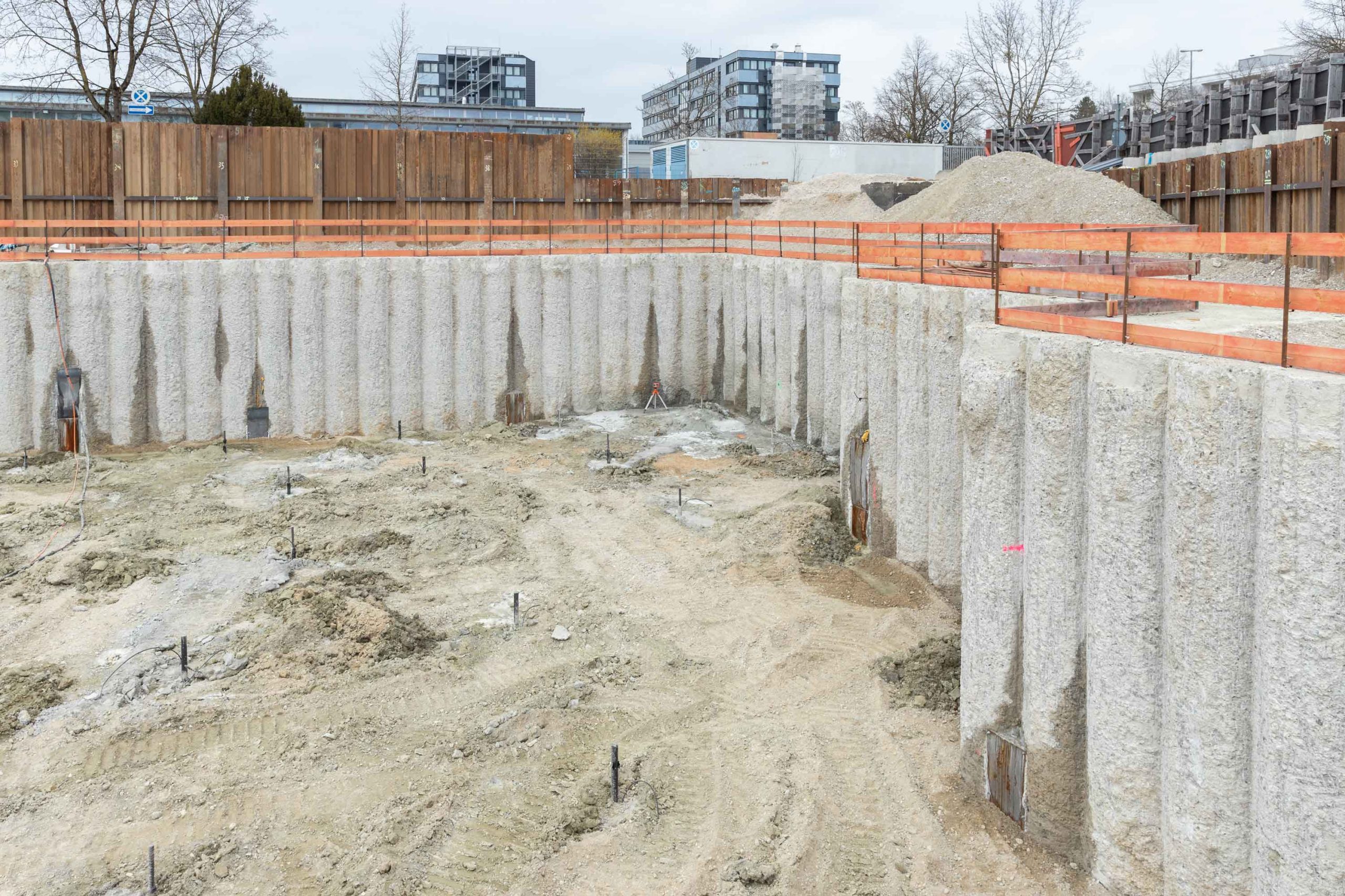 Die Baugrube mit einer Tiefe von ca. 8,6 m erstreckt sich im Bauabschnitt 1 über eine Fläche von 6220 m² und im später folgenden Bauabschnitt 2 über 5670 m². Der erste Bauabschnitt ist von freistehenden Pfählen mit 1,5 m Durchmesser sowie mit einem Vorverbau als Trägerbohlwand umgeben. Um die Auftriebssicherung zu gewährleisten, kam es auf der Nordseite des Areals im Bauabschnitt 1 zur Gewi-Gründung. Zwischen dem Bauabschnitt 1 und 2 wurde ein Dichtschott errichtet.