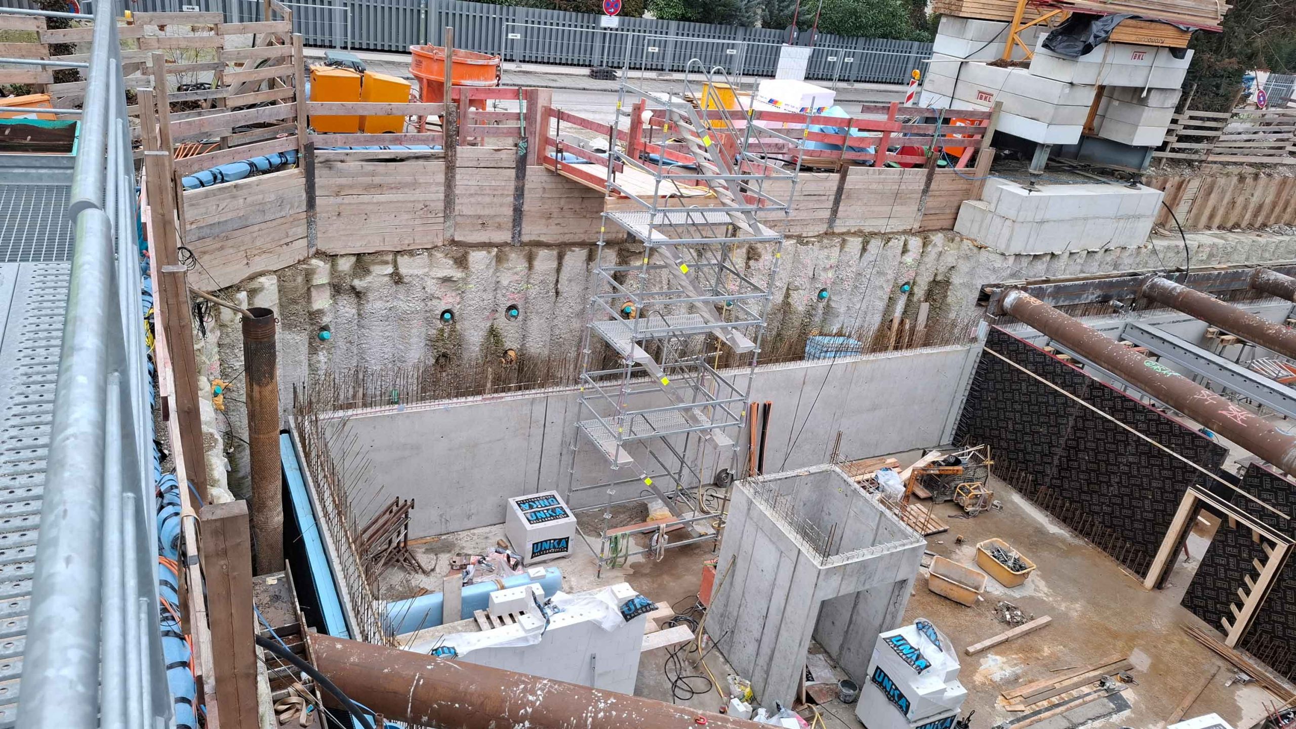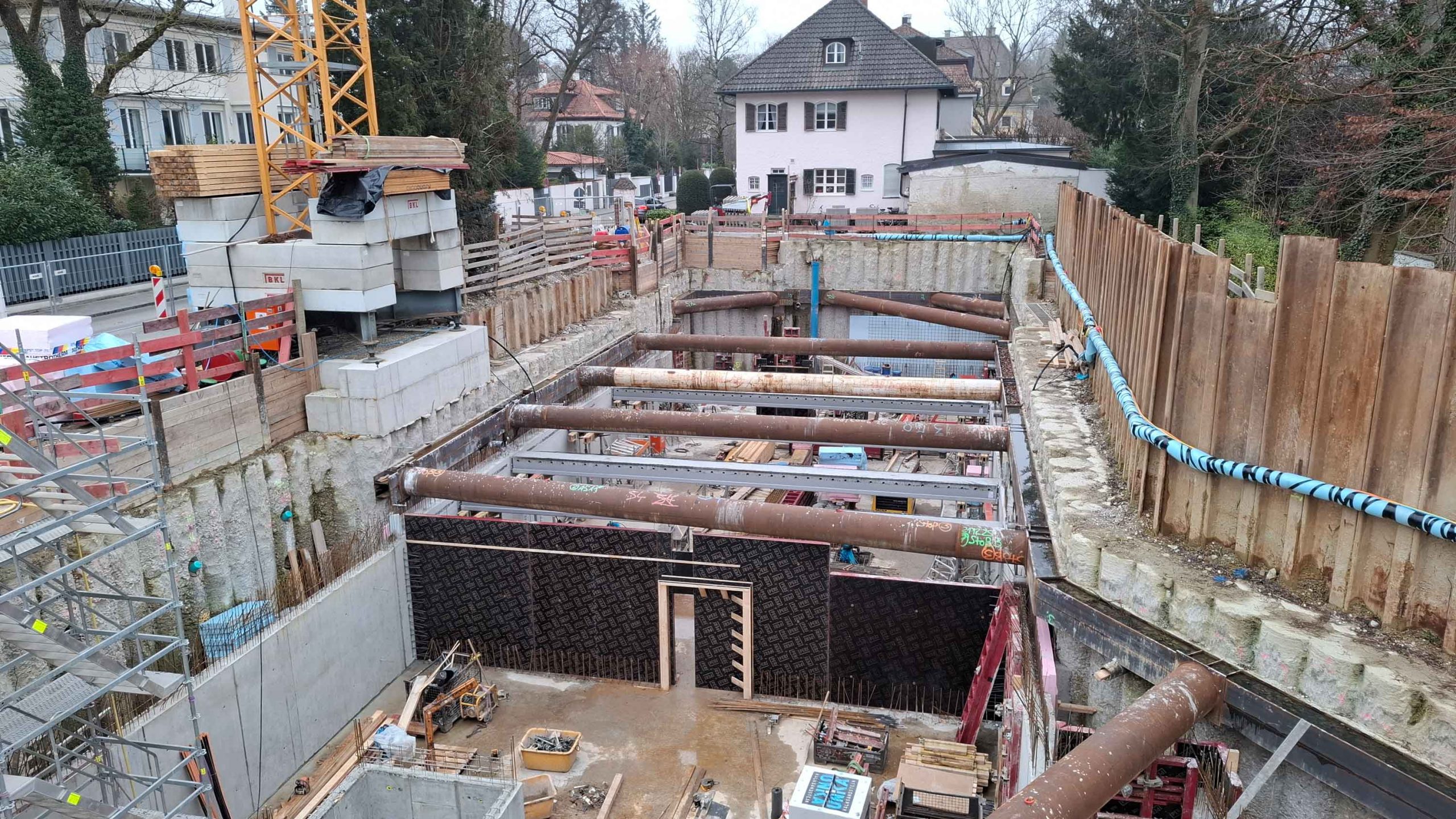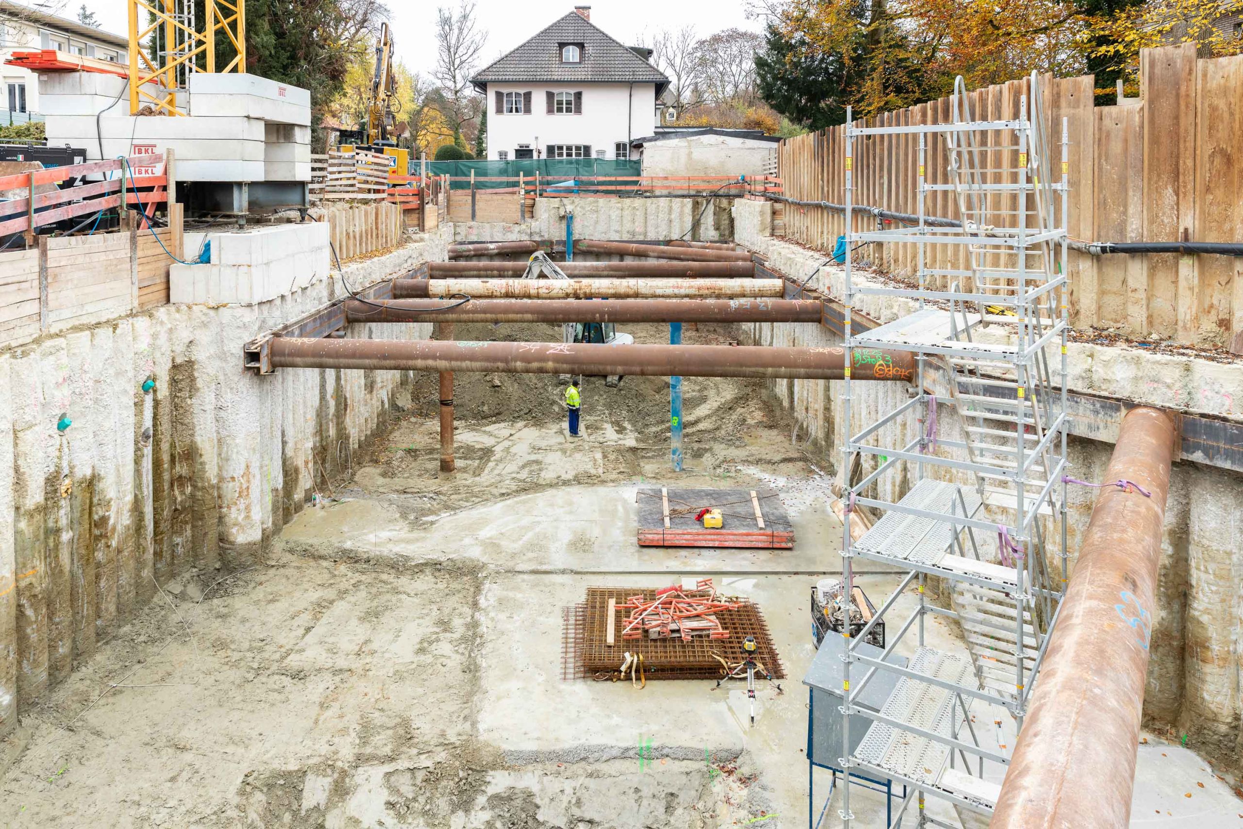 Die Baugrube hat durchgängig eine Tiefe von ca. 7 m und ist im Bereich des geplanten Autoaufzugs der Tiefgarage ca. 8,5 m tief. Unsere Ingenieur:innen und Konstrukteur:innen planten für dieses Projekt eine Innenaussteifung zu den benachbarten Grundstücken und eine Rückverankerung in die öffentlichen Straßen.