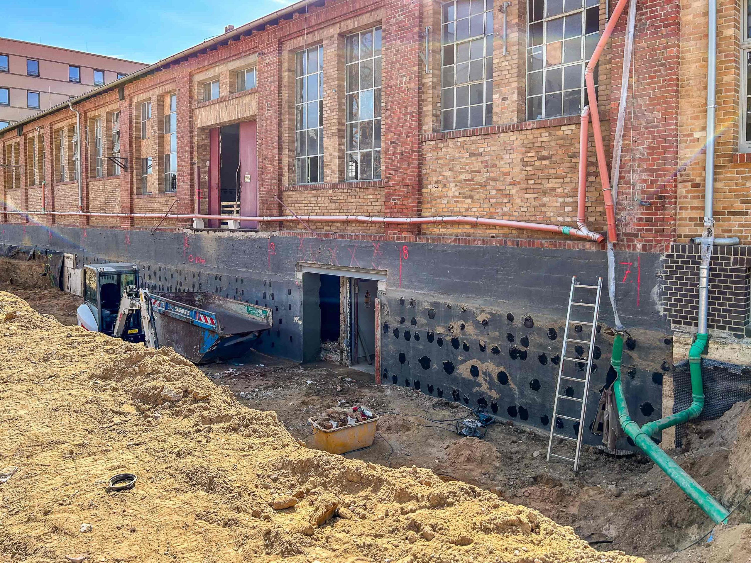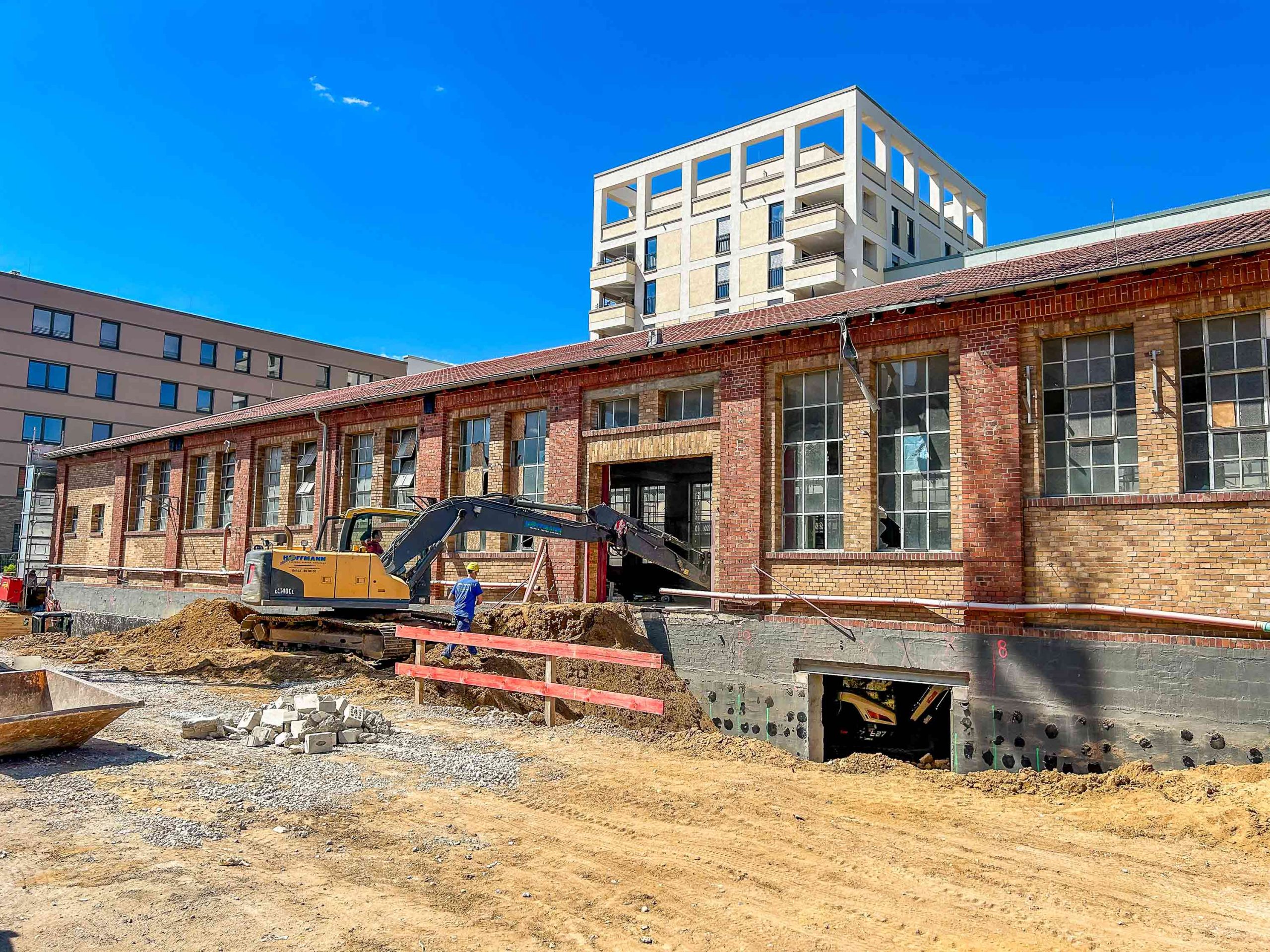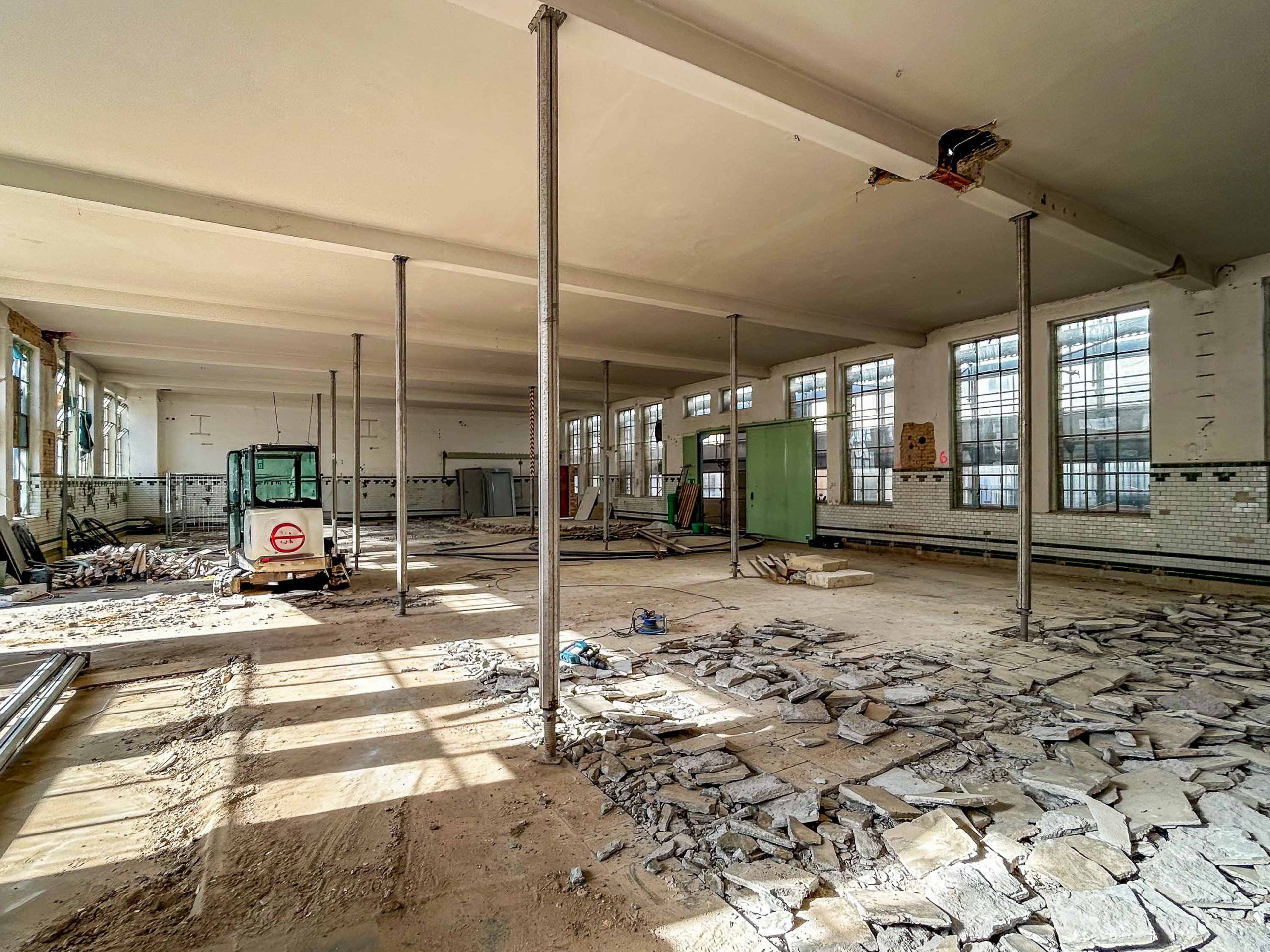 Mit Errichtung des Krans konnte es losgehen und so wurden entlang der Ostfassade der bestehenden Markthalle Unterfangungen für den späteren Technikanbau angelegt. Nach Fertigstellung der Unterfangungen beginnt der Aushub der Baugrube für den Technikbau. Im Inneren schreitet die Entkernung nicht statischer Bauteile weiter voran.
