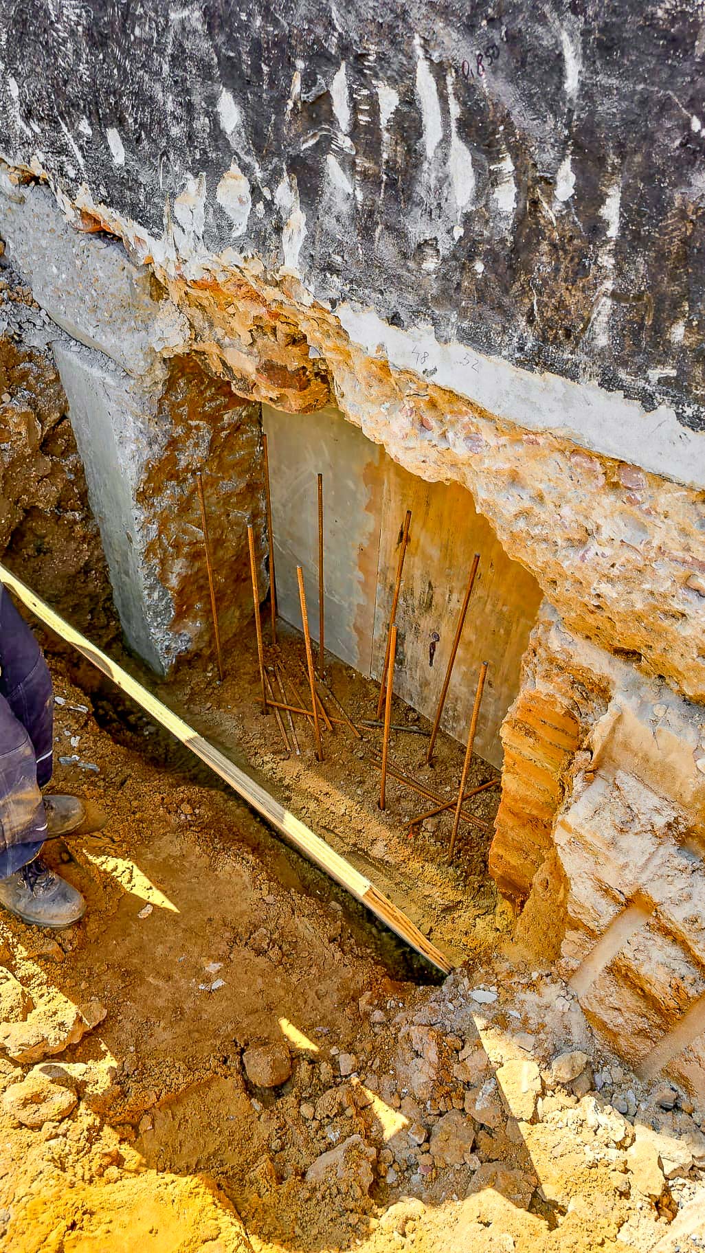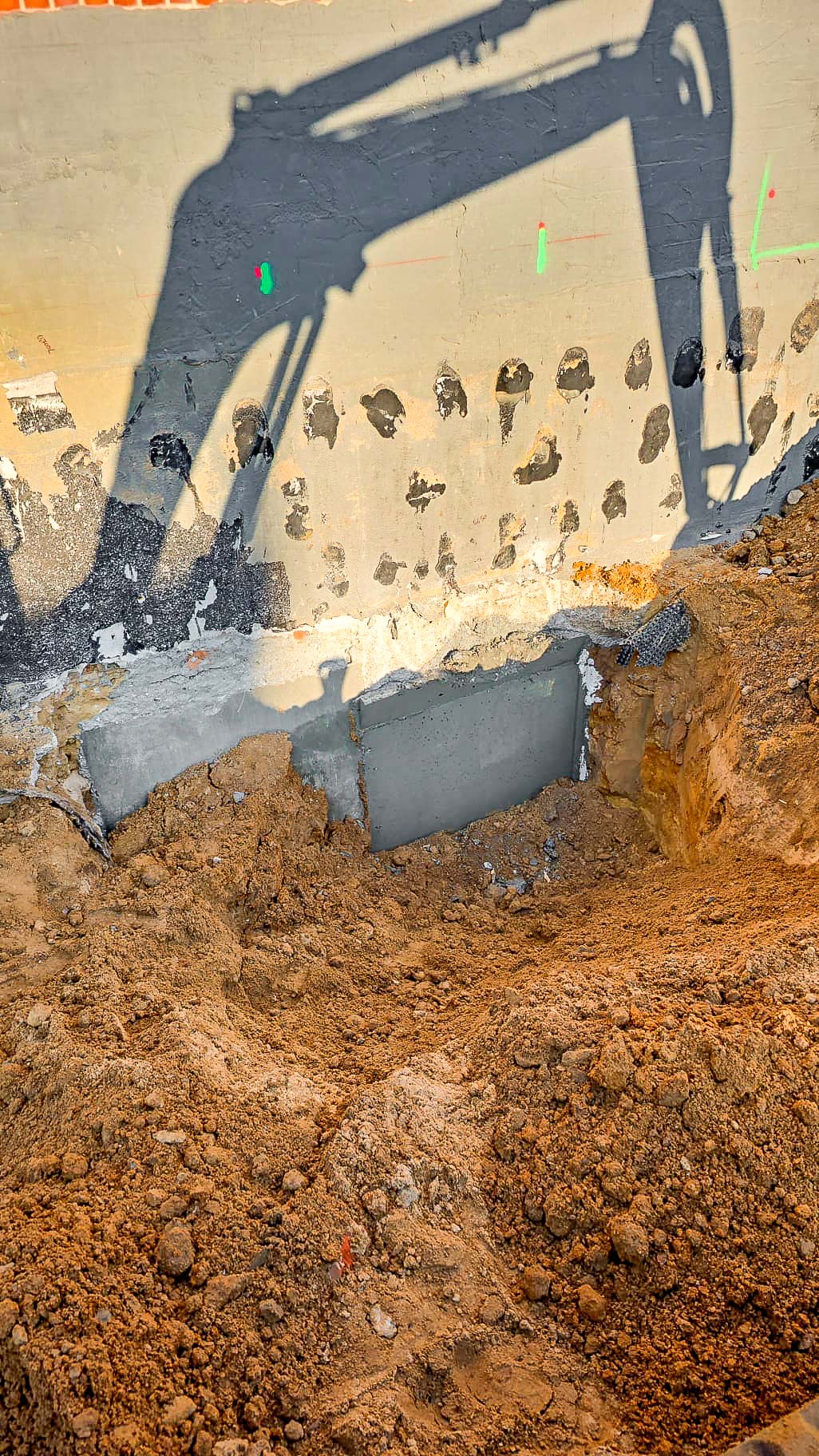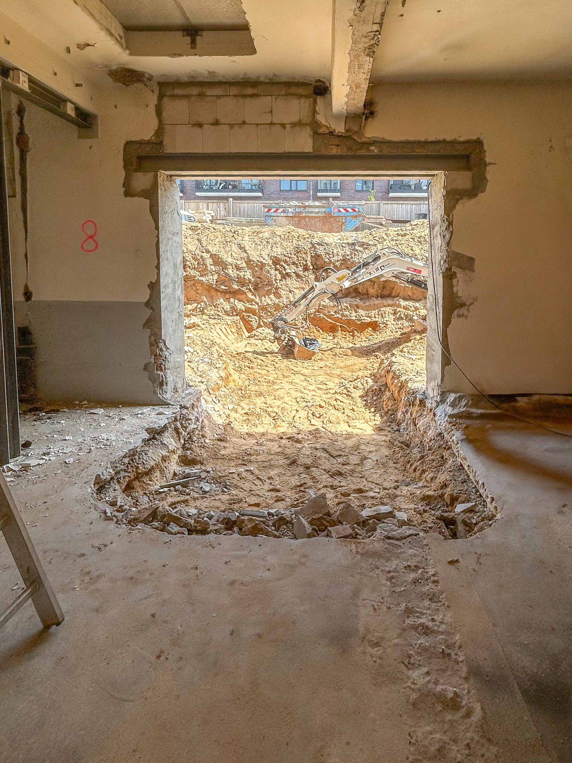 Mit Errichtung des Krans konnte es losgehen und so wurden entlang der Ostfassade der bestehenden Markthalle Unterfangungen für den späteren Technikanbau angelegt. Nach Fertigstellung der Unterfangungen beginnt der Aushub der Baugrube für den Technikbau. Im Inneren schreitet die Entkernung nicht statischer Bauteile weiter voran.