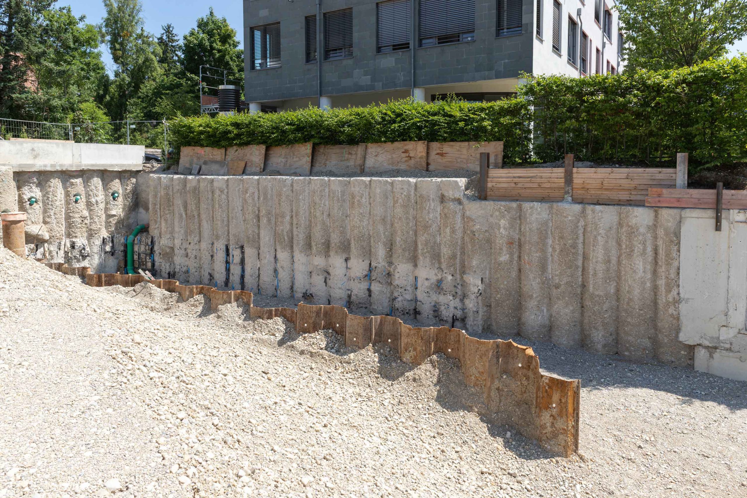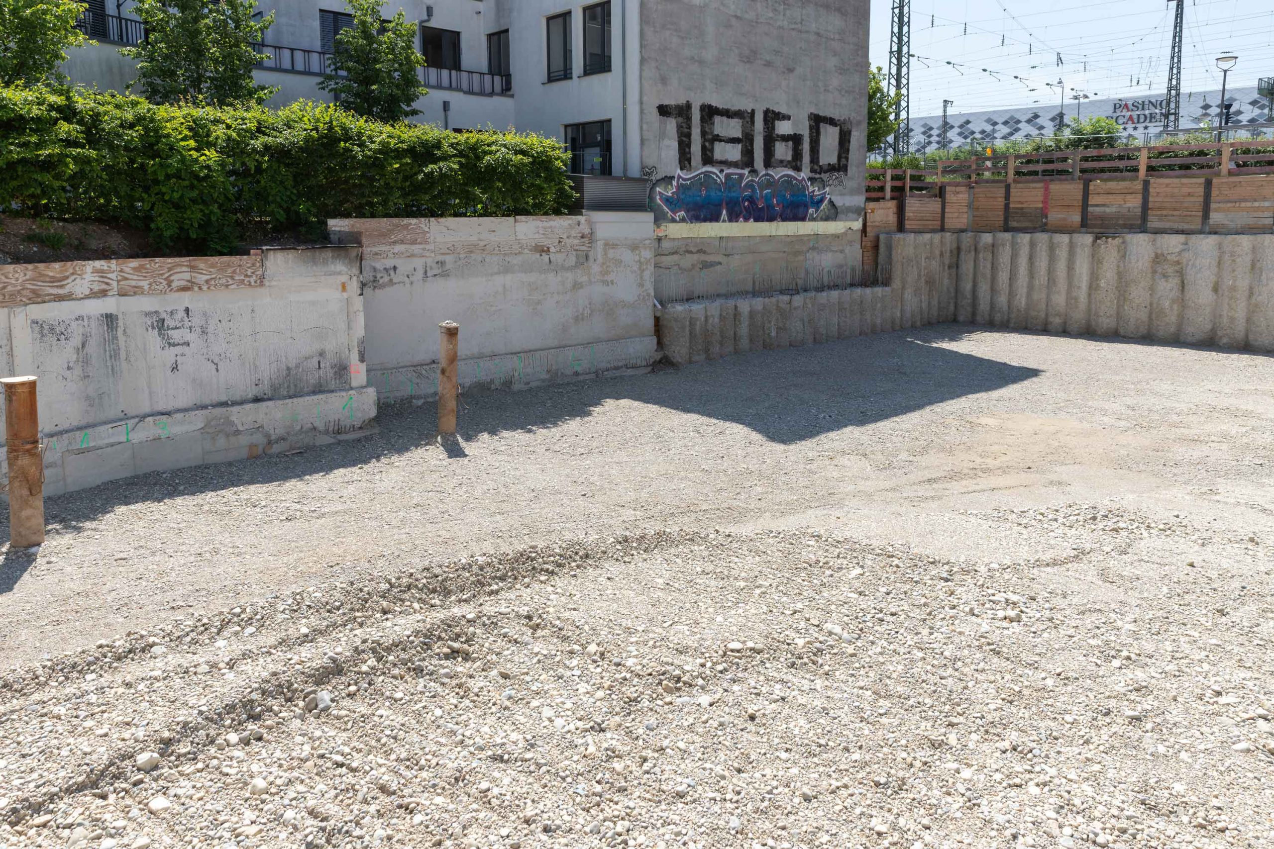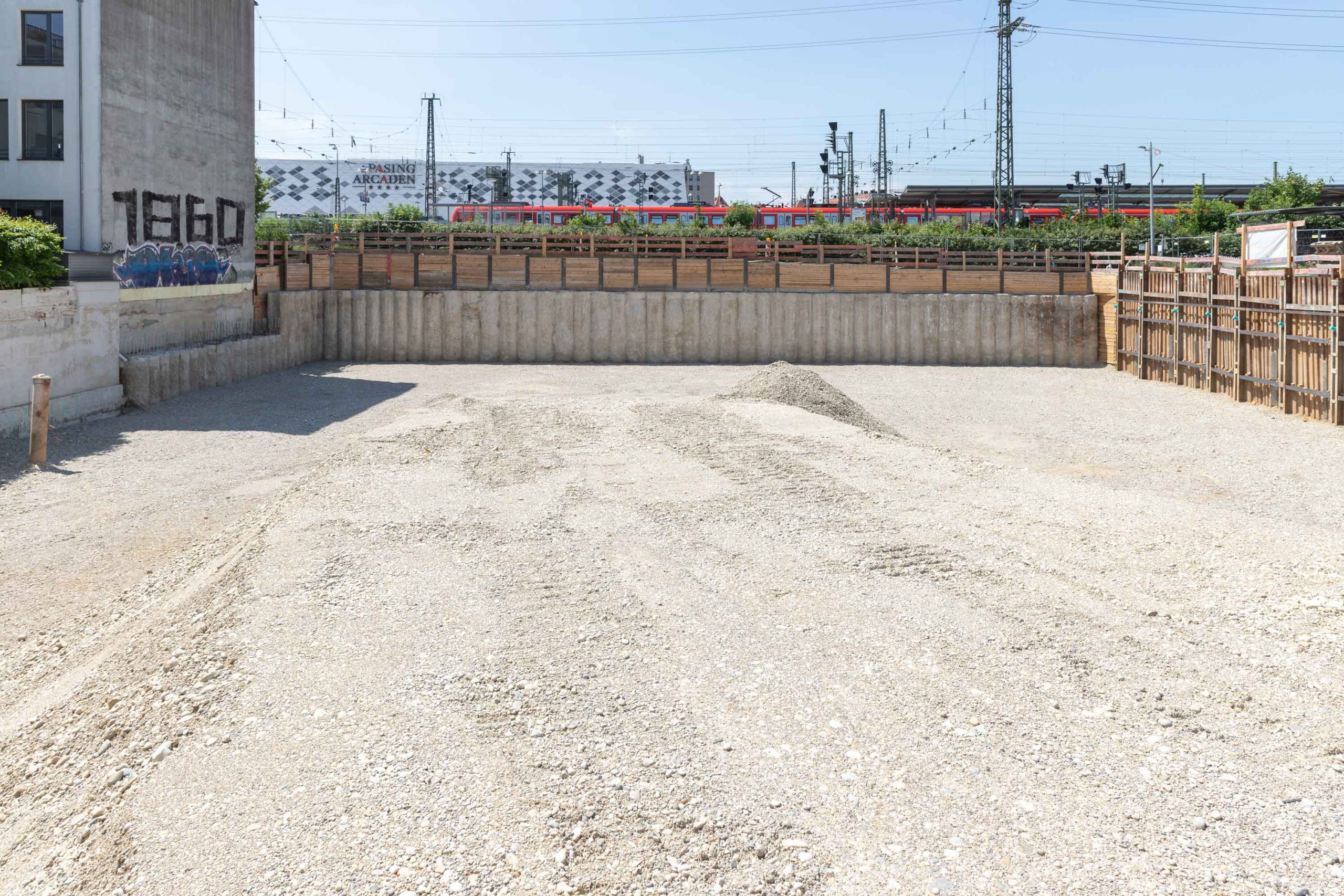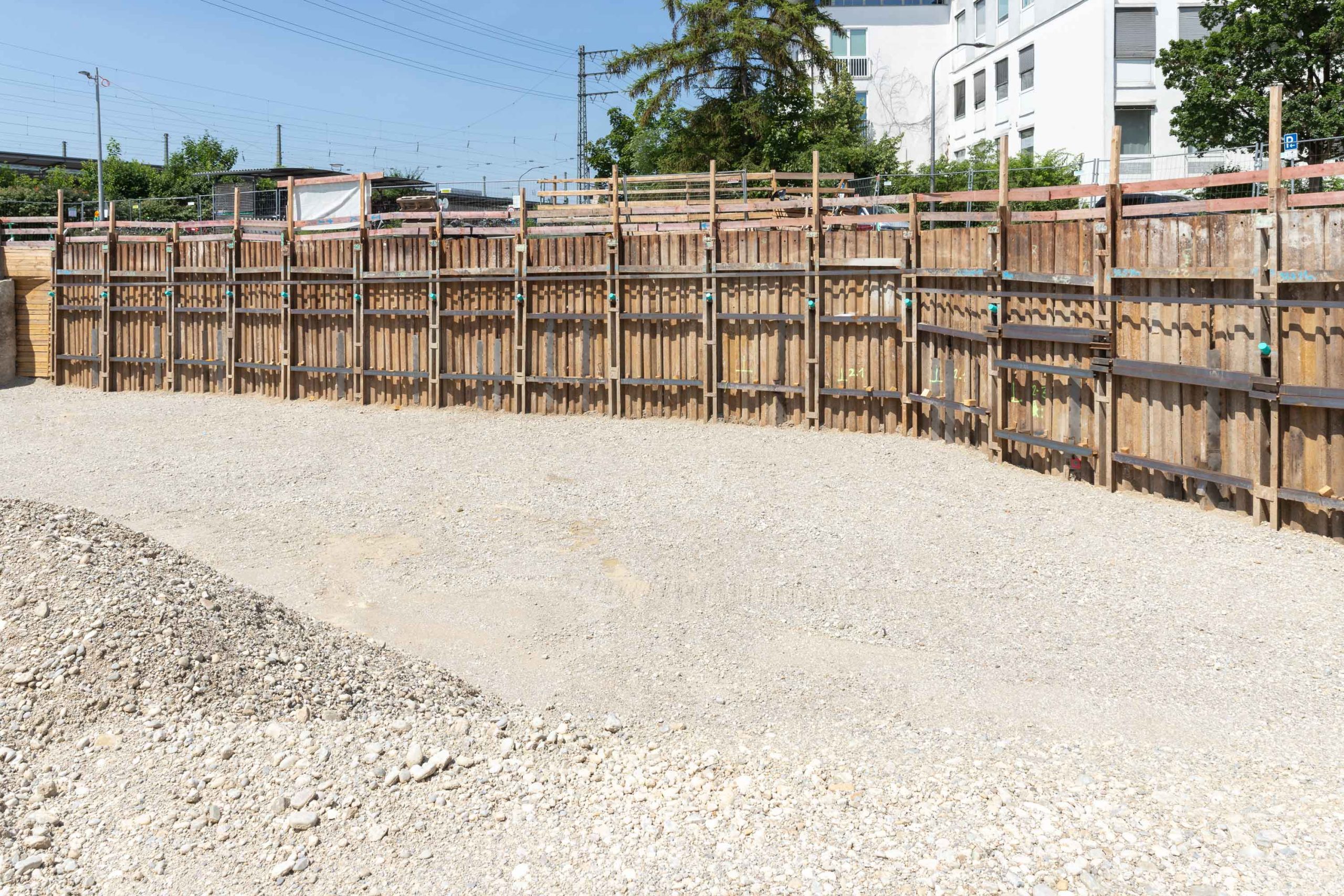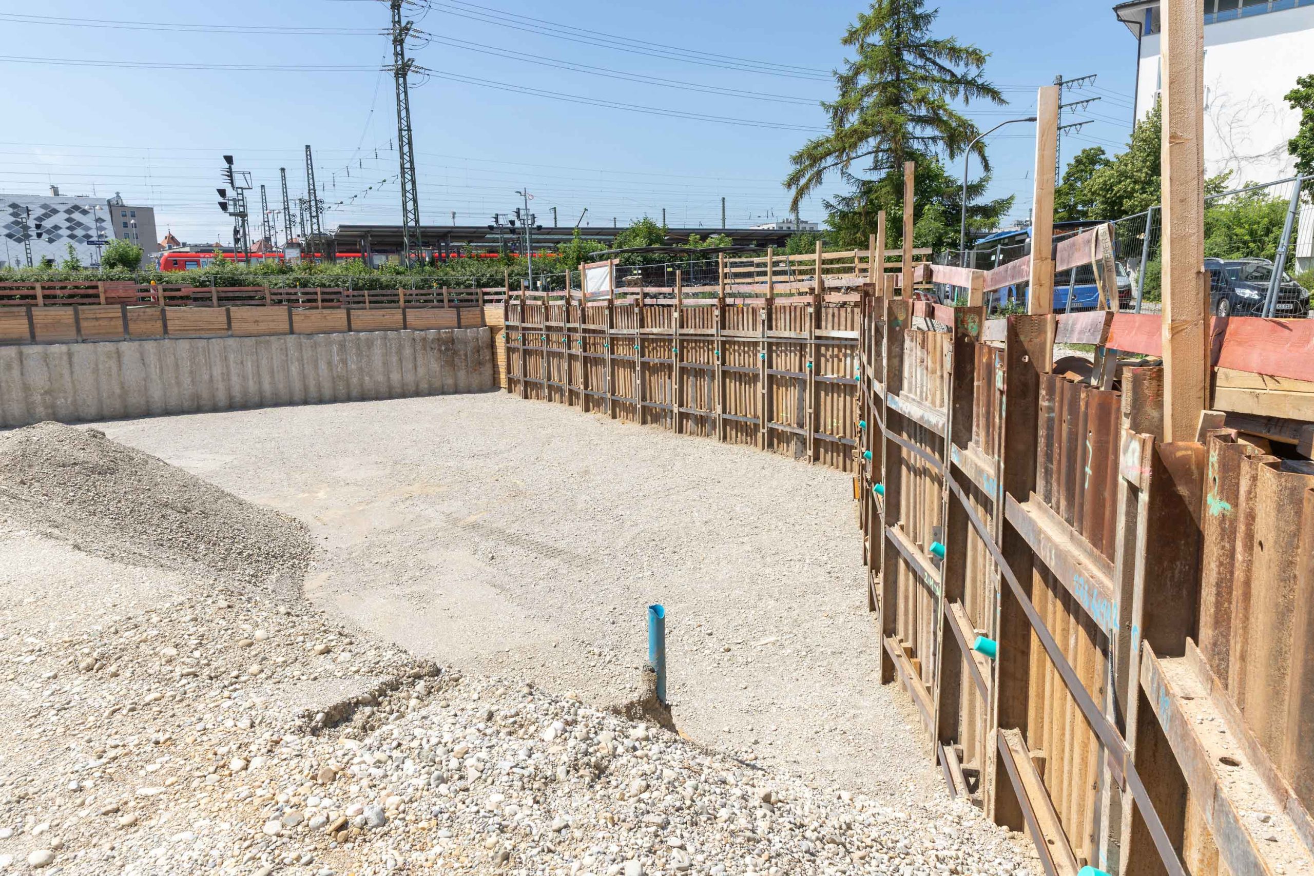 Die Baugrube weist eine Tiefe zwischen 5 bis 6 m auf. Unsere Ingenieur:innen und Konstrukteur:innen planten für dieses Projekt freistehende Bohrpfahlwände sowie rückverankerte Trägerbohlwände zu den benachbarten Grundstücken und mussten aufgrund der direkten Nähe zu den Bahngleisen besondere Auflagen der Deutschen Bahn einhalten und über die Bauzeit mittels einem Monitoring überwachen.